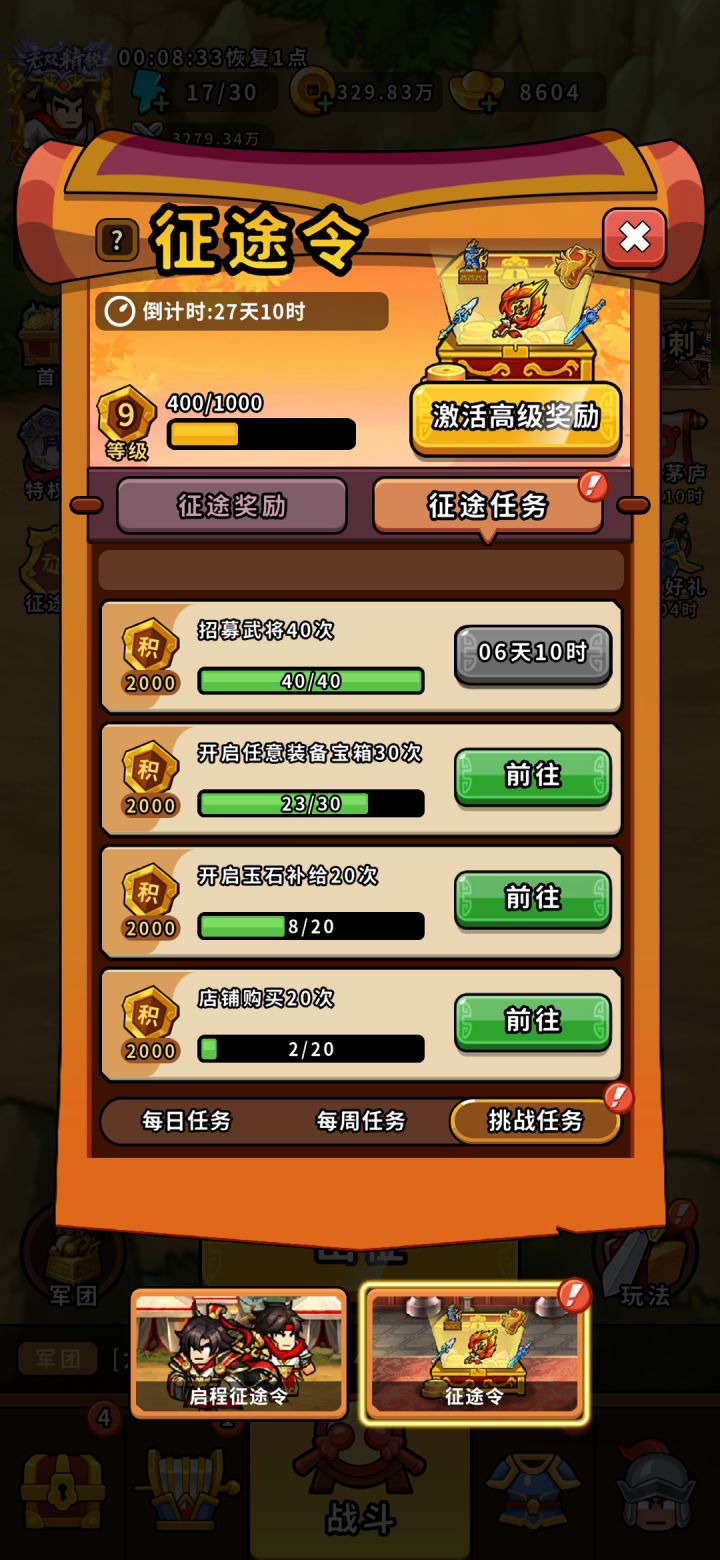 说在前面:作为竖屏摸鱼副游 主要看双卡或者三卡是否丝滑 本人一个月玩家 月卡到期没有氪了 感觉还行 战力方面 感觉顶多越5%战力pvp 再高了就打不过了 闯关很有特色 跟运气有一定关系 可以越战力闯关 下面开始说攻略:1.这游戏得存资源 特别是粮草和百炼锤 每次活动必须要存5000 可以拿满奖励(很丰厚) 然后就是洛阳铲和英雄令 必须100以上 以100为单位 最多500个(奖励拿满) 多了就存