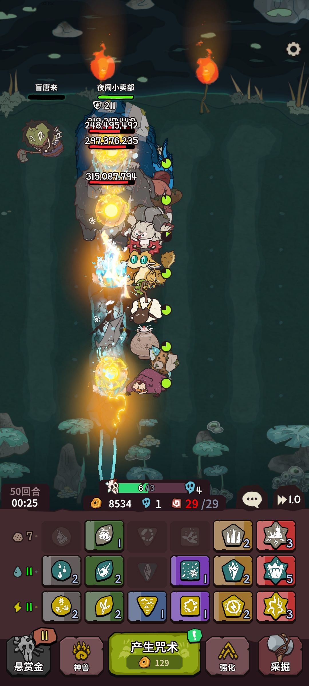 宠物从上到下:大祭司6级(6级技能是永久叠加攻击,一开始以为是临时的),哔哔6,猫头鹰1,闲者6,罐子6,啵啵6,青蛙1。 土水电:天谴4级,不卡牌土铁布衫全留叠盾,水冰柱至少留一个。 有两个天谴雷的时候就可以刷最后一个悬赏,一路刷到40波左右,运营得好有三个满级强化,先强电,再强水,最后土或者宠物。我过50的阵容只强满两个,天谴电3个,水5,土3。 前期我运营一般在16-18回合概率就满了,然后