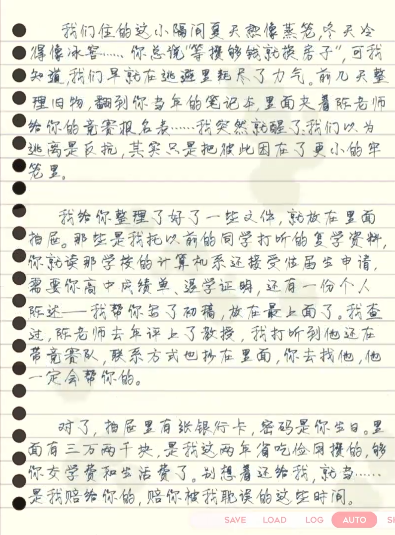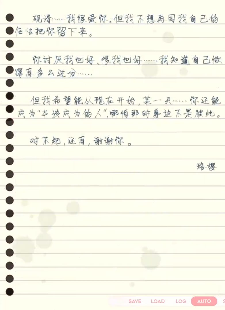 【剧透警告】在我游玩了正式版后,我认为Bad End 2是最意难平,也最令我恐惧与不安的结局。结局概要:珞樱在那个雨夜离家出走后打电话给正在备战计科竞赛的砚清,请求砚清可以带她逃走。后来两人在外住下,成天打工,而那个小房子冬冷夏热,砚清说要换个大房子住——问题是,他们的经济实力怎么能支撑的起这些呢?雪上加霜,他们因为缺勤过多,而双双被大学开除。后来,某一年砚清的生日。珞樱问砚清,回不回家