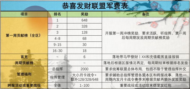 星汉同辉联盟备战4月16号新区欢迎大佬咨询,区服名统一后可改,为荣耀加冕一、管理军费 ①核心管理军费 双卡+128红包 ②处理联盟矛盾 双卡+100元红包 ③战略官+指挥 双卡+500元红包 ④赛季末管理专属红包1000元 (管理群进行发放)要求带联盟统一前缀,正常玩的轻轻松松。 赛季末洛阳高战群发千元以上群红包二、活跃奖励本周高出勤报销下月周卡本月高出勤报销下月月卡活