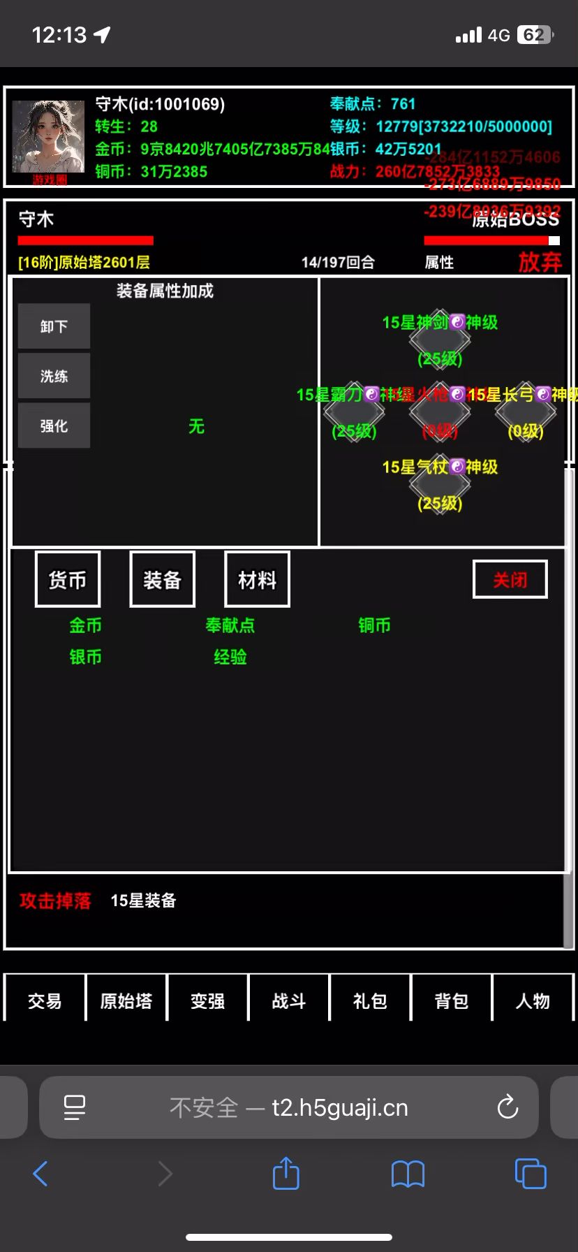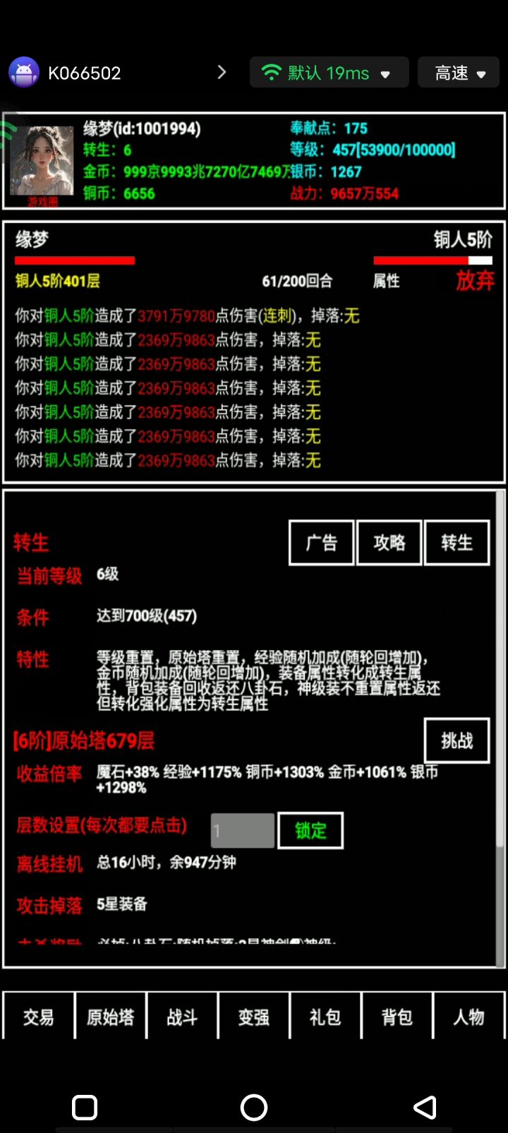 游戏进去先领各种礼包,公测礼包和五星评价礼包找群主激活,然后看下广告拿奉献点和金币,这样就可以点一级广告里面的加成了,然后端午和61礼包也能多领一级礼包,称号可以在背包里面使用 注意签到先不要点,签到受轮回等级加持,轮回高一点得的奉献点多一点 再就到群里找大佬嫖点金币,拿来点变强里面的属性强化,八卦石推塔杀boss会掉落,回收装备也会有 这里推塔可以一直推,中间有装备就带上,带神级的装备星级