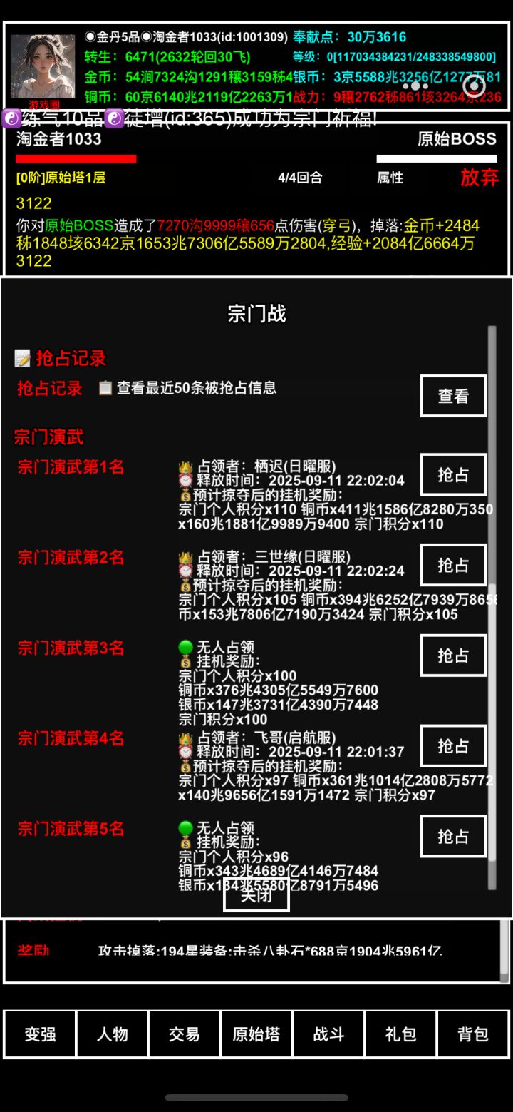 0910更新:1、修复魔域坑位重启没收益的问题2、阴傀殿优化显示一层3、新增境界预览面板,飞升增加的轮回加速调整,天人五衰不纳入正常境界4、矿场占领没收益5、新增跨服战力榜6、飞升支持批量合成,被刷了记得尽早和我说,要归档7、增加教师节礼包 #发现好游戏 #探索无止境