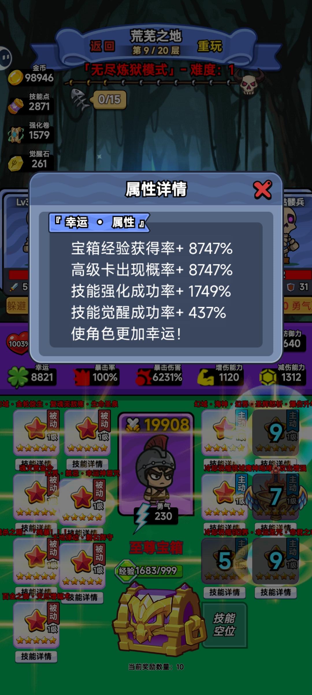 满级箱子奖励除了以上截图还有各种属性点 还有让所有技能全部绝醒的道具大家可以学习利滚利无限加金币在配合每有100金币加百分比伤害的技能 怪物属性永远跟不上你的成长速度 怪物只有几百几千生命的时候 你一个攻击就可以打出好几千万亿兆的伤害了 不想被反伤怪反死自己的话就把那个有金币加伤害的技能给忘了 这样就不会自己打死自己了 目前东西太少了随随便便就通关看看后续更新怎么样