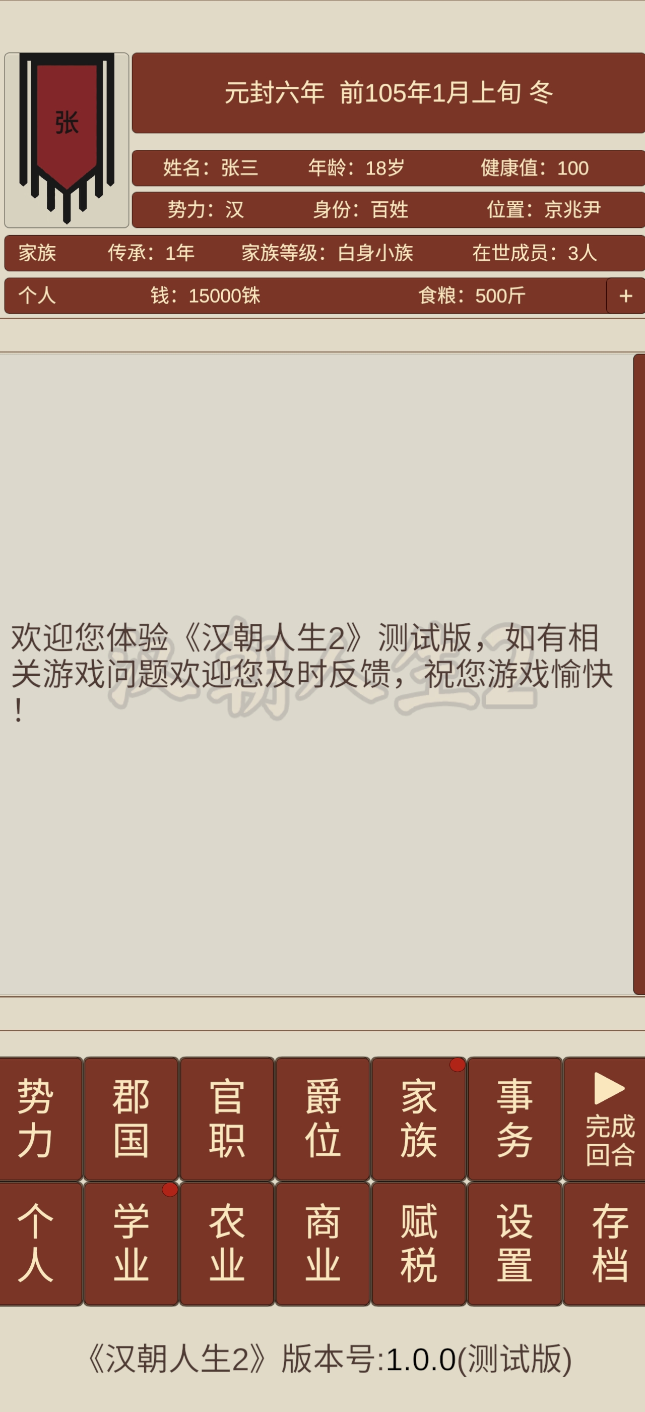 《汉朝人生2》是一款以模拟经营为题材的单机文字游戏,在此,您可耕耘田亩,纵横商道,更可将家业世代传承。传奇之路,待您执笔!