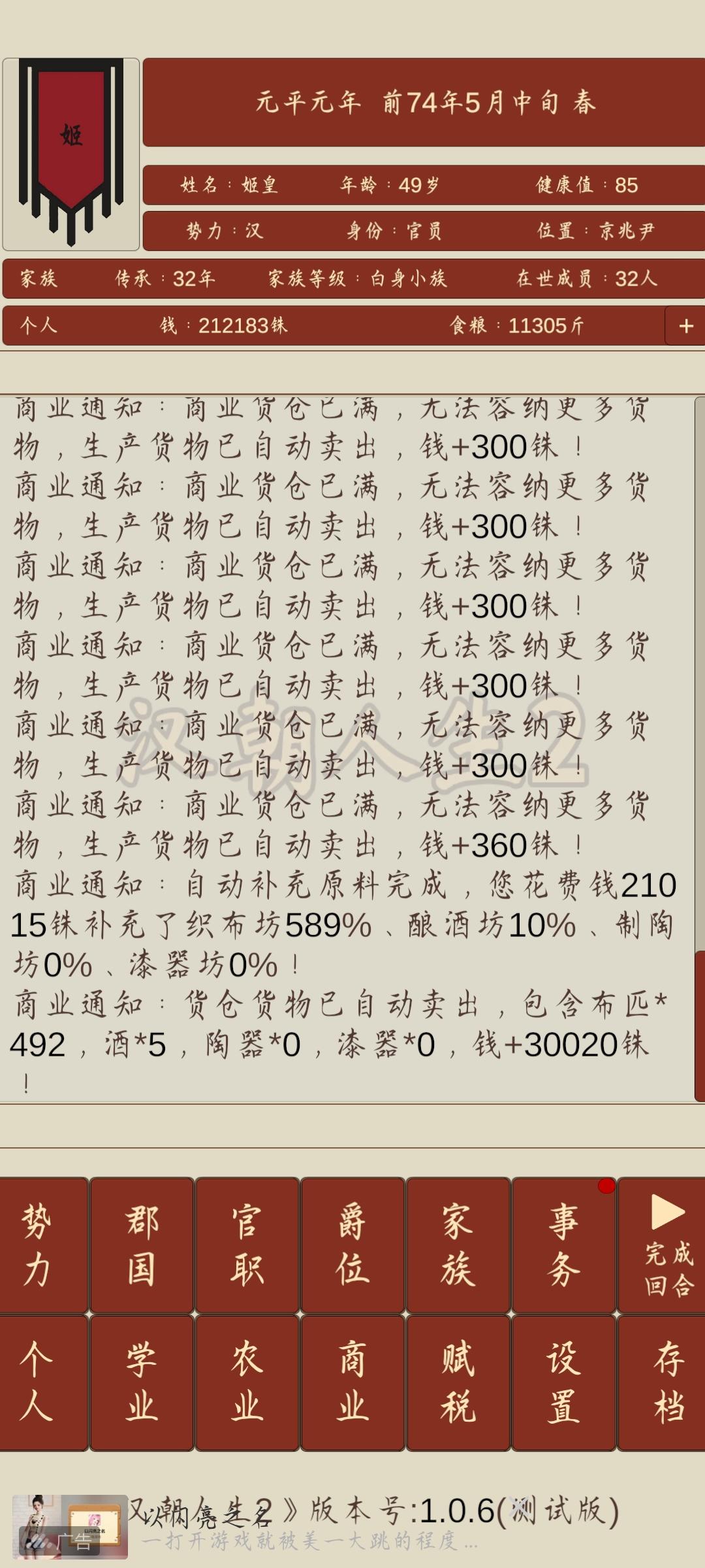用了一百年三代人成功自立刚进游戏调整属性一定将学识调整到30,30就可以直接做官了,学业里的学识谋略之类的可以不用管后期有钱了随便挂一下就满级了。开局先做官然后将能看广告开自动的都打开能省不少事。自立的条件是列候(我是把104个郡国好感度拉满自立的所以时间比较久一共花了102年,群友说可以拉拢50个郡国然后自立征重税招募50w兵平推过去只用七十多年)官职和爵位挂着就行,这游戏70岁退休,第