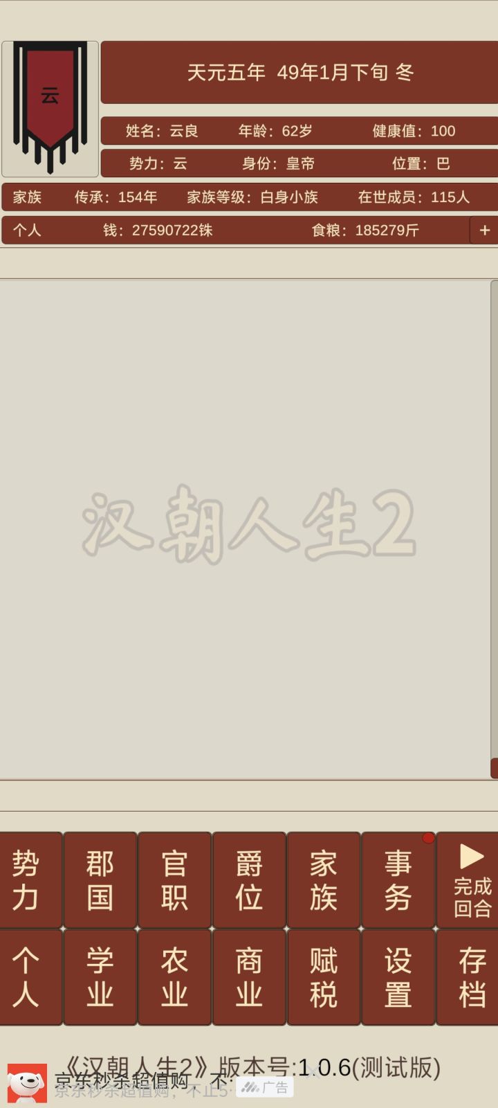 用了一百年三代人成功自立刚进游戏调整属性一定将学识调整到30,30就可以直接做官了,学业里的学识谋略之类的可以不用管后期有钱了随便挂一下就满级了。开局先做官然后将能看广告开自动的都打开能省不少事。自立的条件是列候(我是把104个郡国好感度拉满自立的所以时间比较久一共花了102年,群友说可以拉拢50个郡国然后自立征重税招募50w兵平推过去只用七十多年)官职和爵位挂着就行,这游戏70岁退休,第