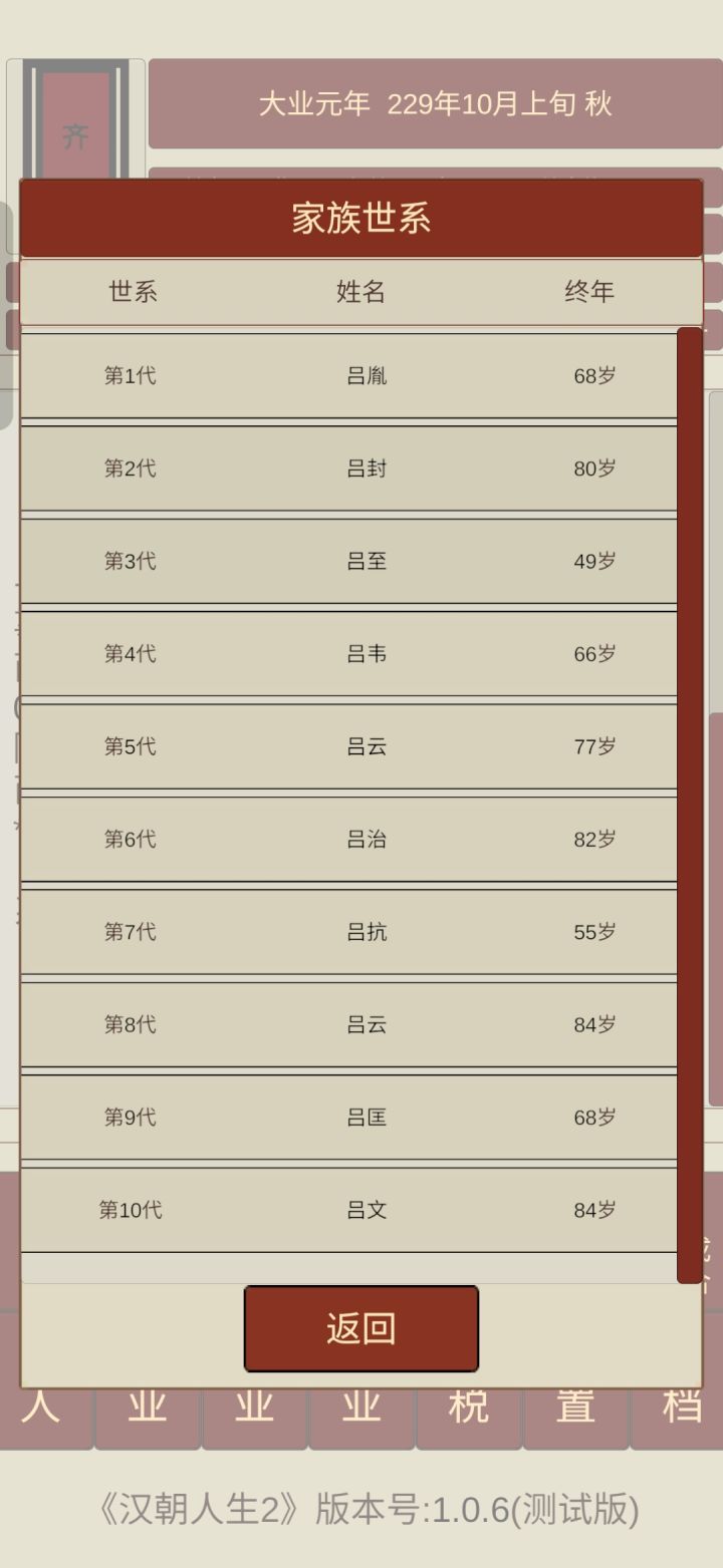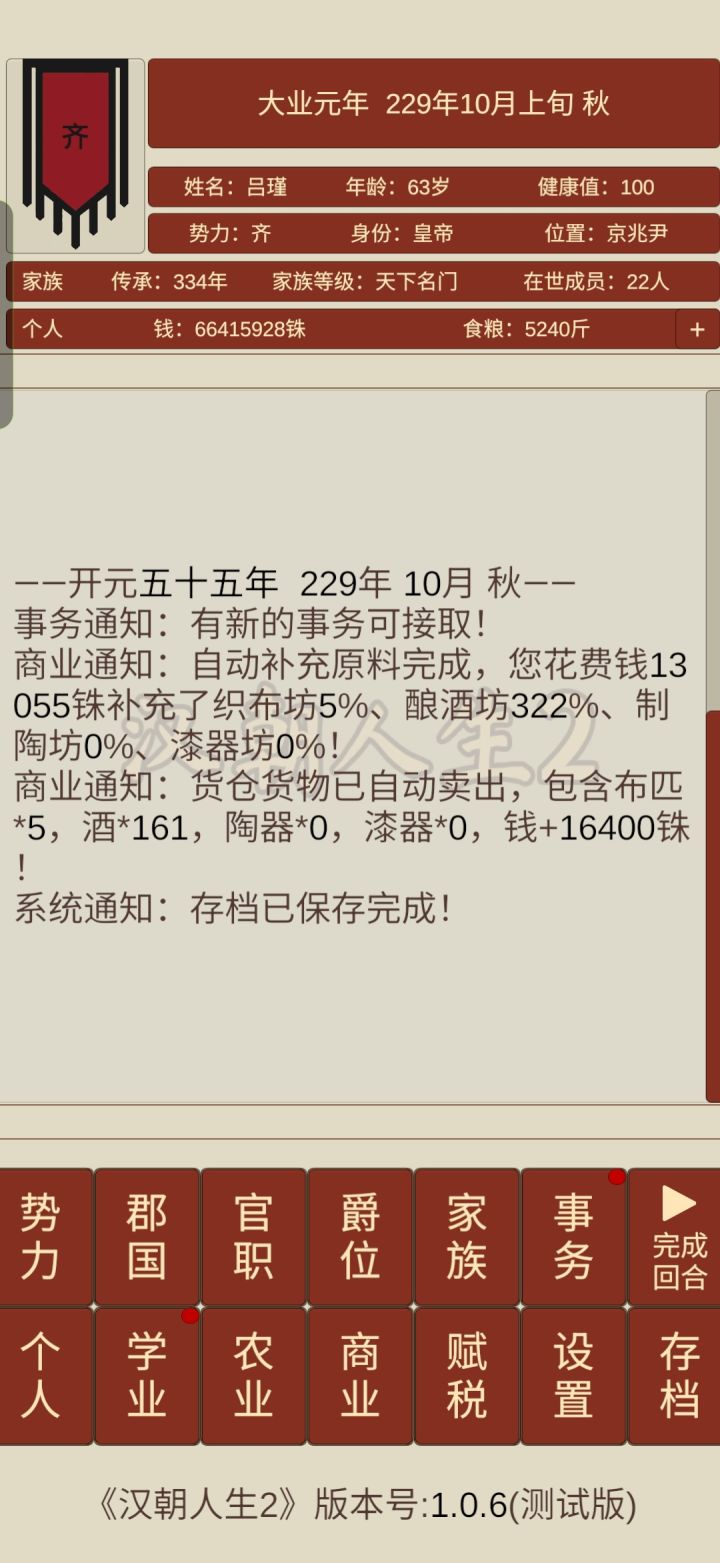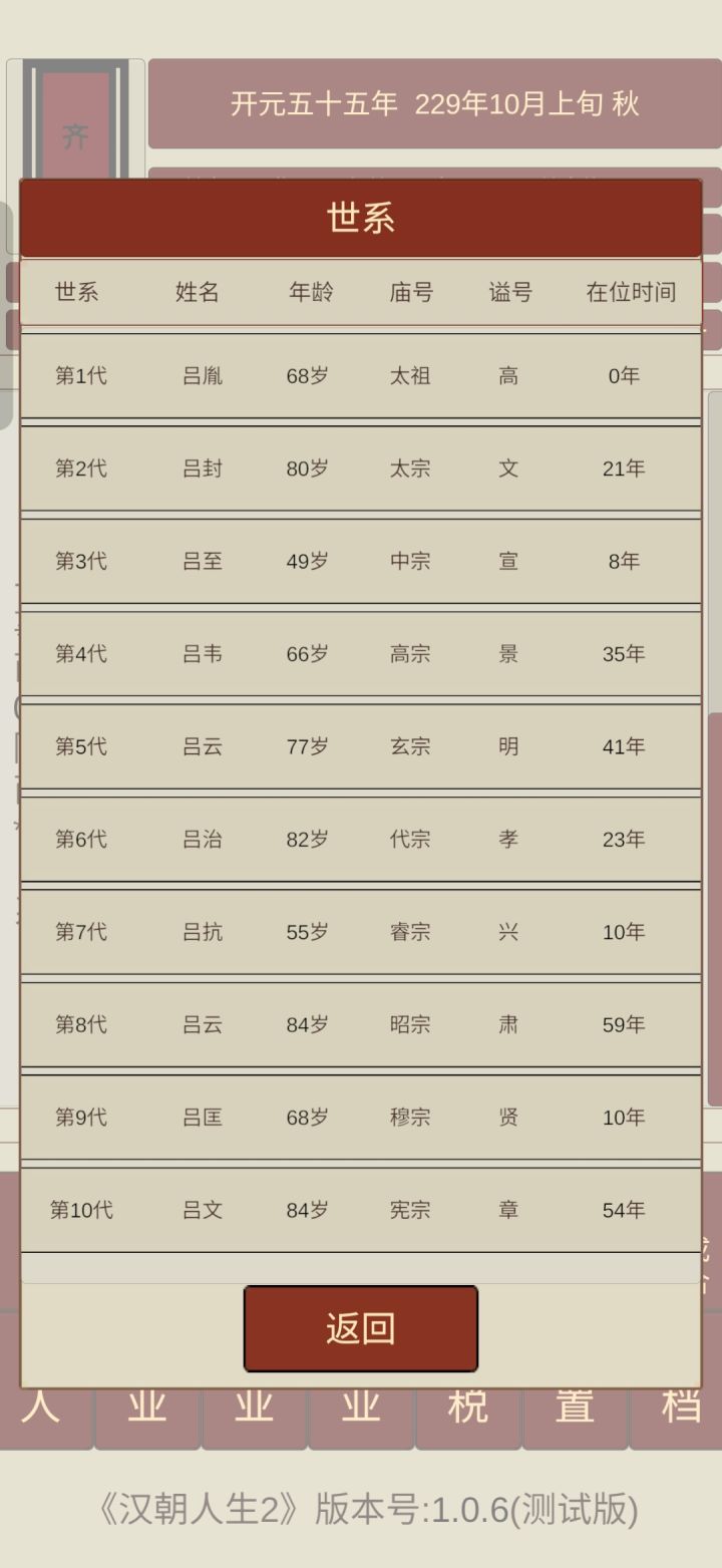 用了一百年三代人成功自立刚进游戏调整属性一定将学识调整到30,30就可以直接做官了,学业里的学识谋略之类的可以不用管后期有钱了随便挂一下就满级了。开局先做官然后将能看广告开自动的都打开能省不少事。自立的条件是列候(我是把104个郡国好感度拉满自立的所以时间比较久一共花了102年,群友说可以拉拢50个郡国然后自立征重税招募50w兵平推过去只用七十多年)官职和爵位挂着就行,这游戏70岁退休,第
