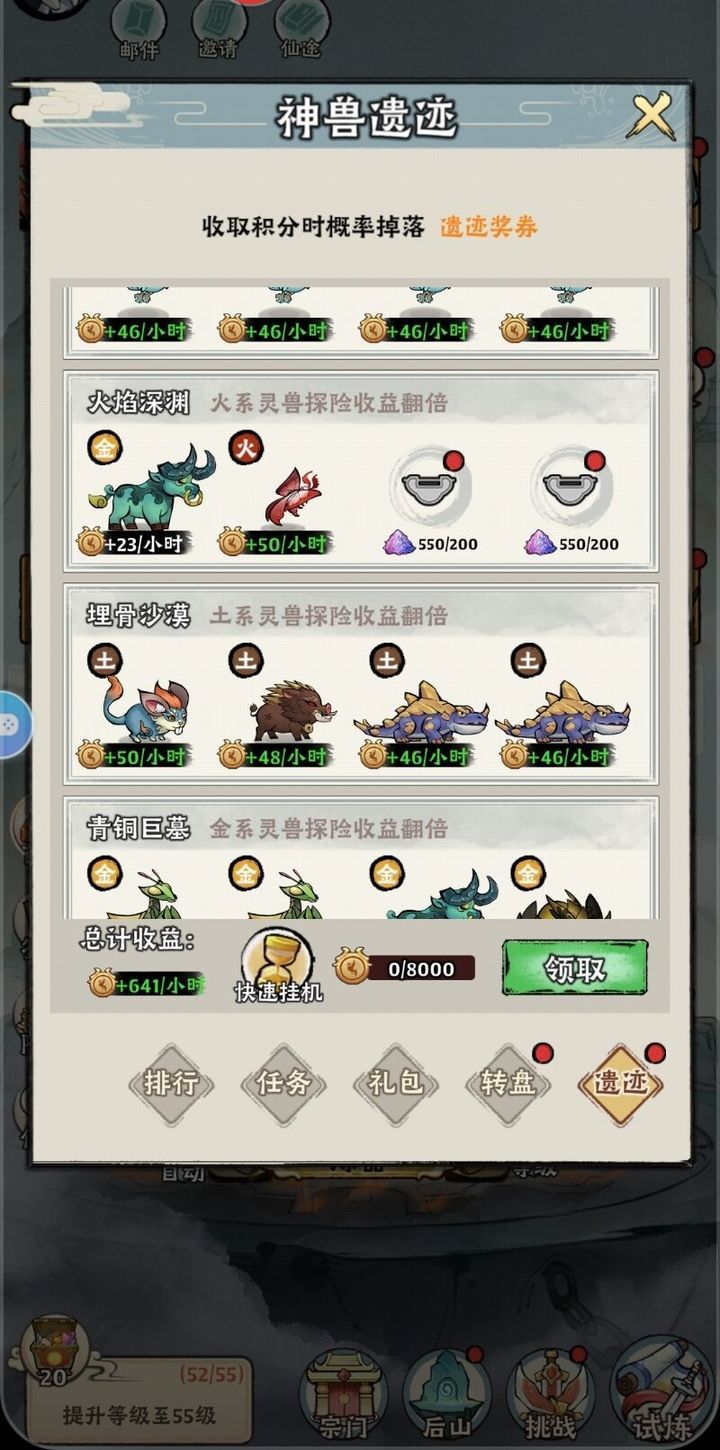 一觉醒来,神兽遗迹已经开始,废话不多说,直接上开服第三天的教程 开服第三天,有两条路选择: 一、第三天凌晨十二点,神兽遗迹准时开启,我们可以提前上线,准备所有材料,快速完成遗迹活跃任务,把更多的遗迹位置开出来,挂满十二,或者十六个灵宠(灵兽属性前面有提到,这里就不过多介绍了),提高遗迹积分收益,这样就可以好好的去睡觉了(此时可能已经凌晨一 两点,还是劝各位注意身体,不要熬夜,随缘玩法讲的是一个缘字
