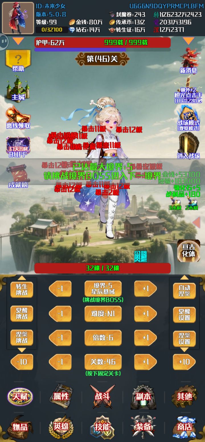 游戏完善度很高,转生觉醒突破境界,然后一二三四境这样提高,还有其他许多另外的玩法内容,种菜收菜等等之类的放置玩法,作者也是很努力的更新,适合上班族挂机。