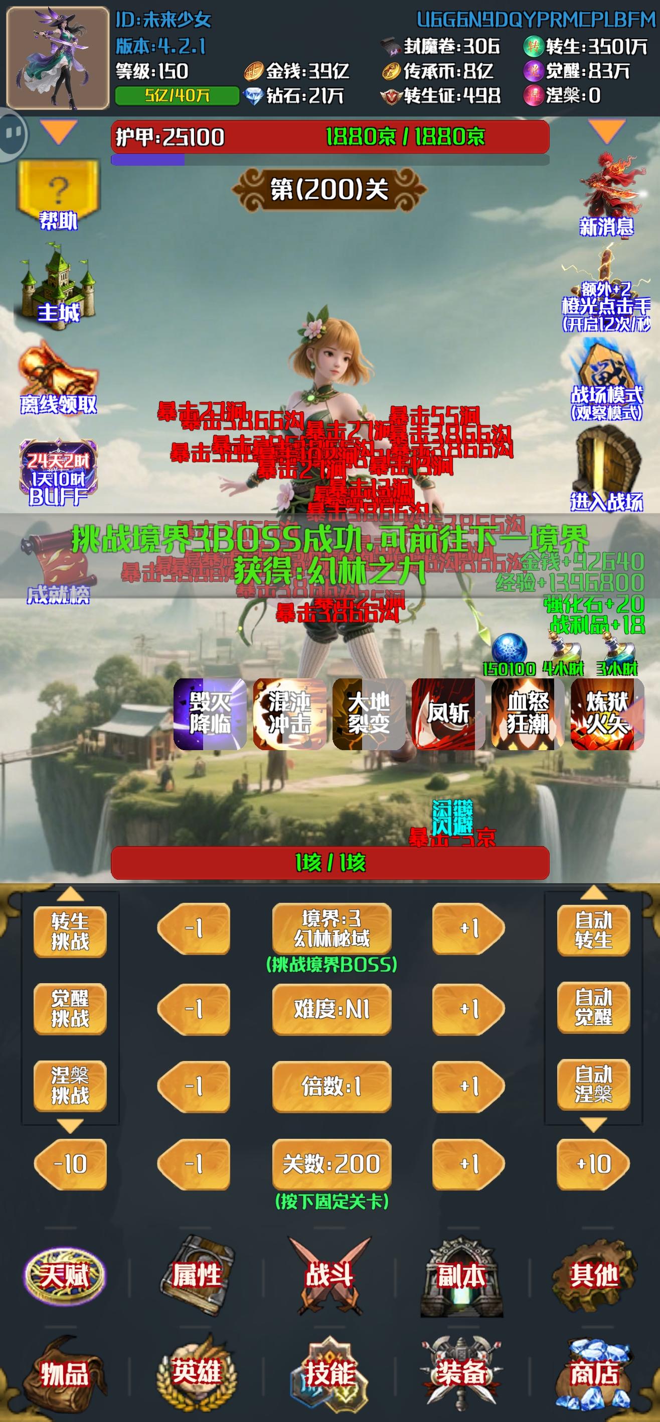 游戏完善度很高,转生觉醒突破境界,然后一二三四境这样提高,还有其他许多另外的玩法内容,种菜收菜等等之类的放置玩法,作者也是很努力的更新,适合上班族挂机。