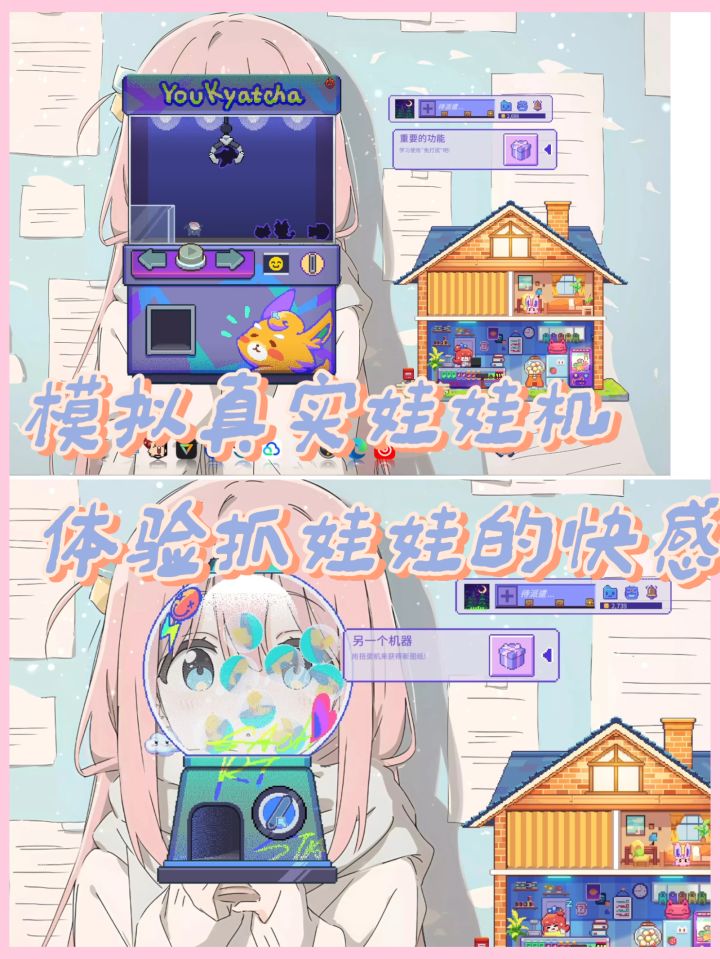【被桌面抓娃娃机硬控的一天】桌面放置挂机游戏我也算是玩了不少,全成就的也有好些个。我对这类游戏的要求有以下几点,我认为达到了才能算是一款合格的桌面挂机游戏。「休闲」玩起来不觉得累,可以不用一直盯着「操作便捷」所有功能按钮都容易分辨,不需要太细致的交互「占用资源低」毕竟是长时间挂机的游戏,资源占用太高反而影响电脑使用「可以一键隐藏」摸鱼好帮手!而桌宠屋也做到了这些,接下来就是看它的小玩法