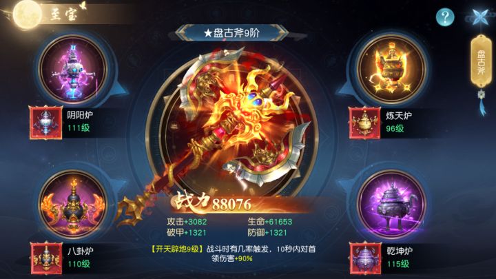 开服第一天开启,当前游戏内有两套至宝,每套至宝分为四小件。盘古斧激活材料:阴阳炉,炼天炉,八卦炉,乾坤炉。盘古斧技能:攻击血量在70%以上的玩家时,额外附带敌人当前血量5%的绝对伤害获取途径:神斧任务或特权商店兑换。收集齐后可激活盘古斧获得大量战力加成与至宝技能加成。可使用特定材料对至宝进行升级,当四件至宝等级都达到25的倍数时可对至宝技能进行升级。