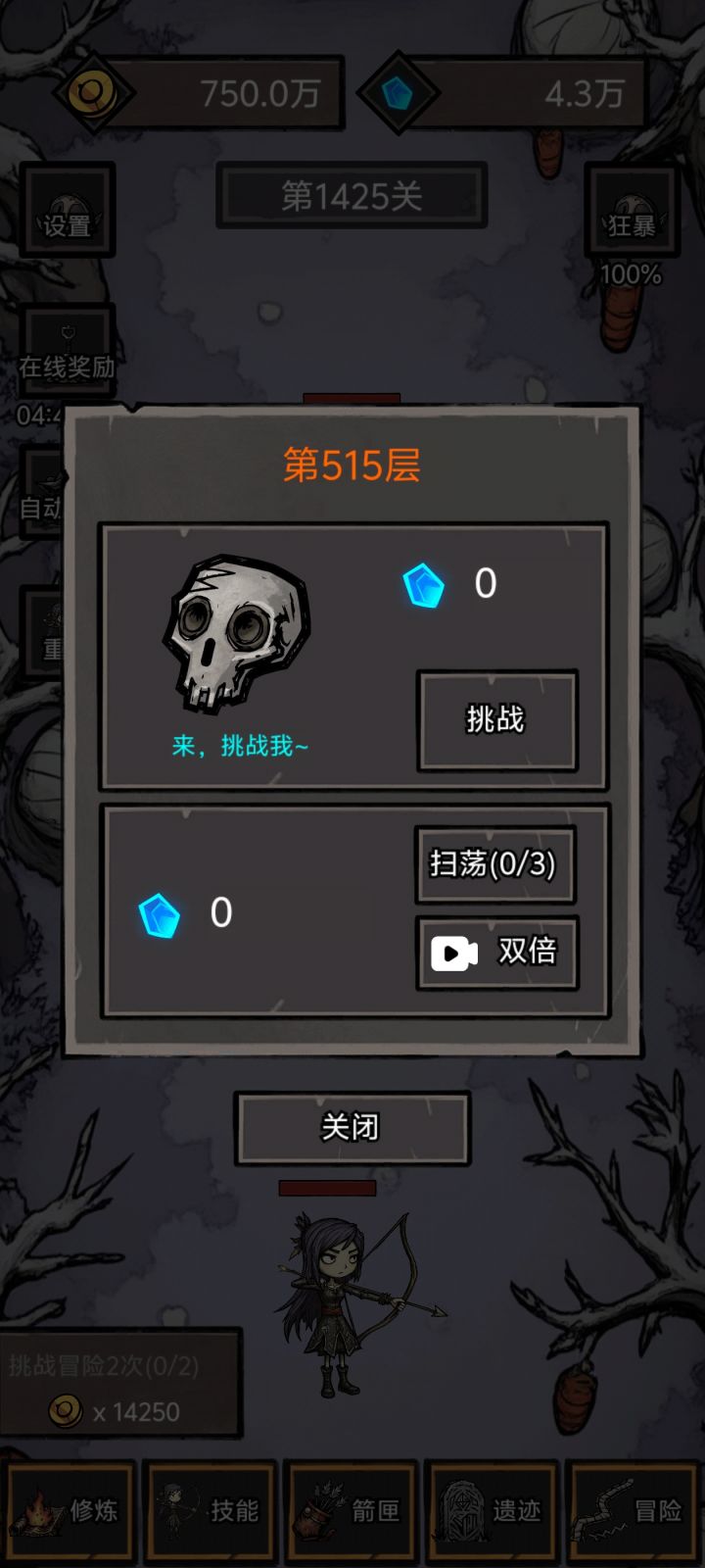 前期有点难,需要时间挺久,打到40关,技能搭配好,过关很快的,2000攻击的剑打出七八万暴击,有离线就更好了