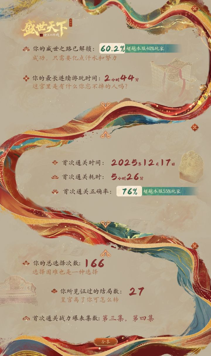 继“浩浩妈”之后,《盛世天下》不管是叙事,还是观看体验上,都是同类游戏中绝对的佼佼者,另一方面,从《隐形守护者》我们能注意到“New One Studio”都能在不依靠社会舆论热点的情况下,为自己的作品赋予正面的意义,在《隐形守护者》中这个意义是家国情怀,而在《盛世天下》的情爱与权谋之下,是女主从家族牺牲品,宫廷小人物,到后宫之主,再到一代女皇过程中所展现的不息、独立与智慧,在流量为主的市场下,不在作品内做营销,让游戏内容只为游戏服务,相当可贵。