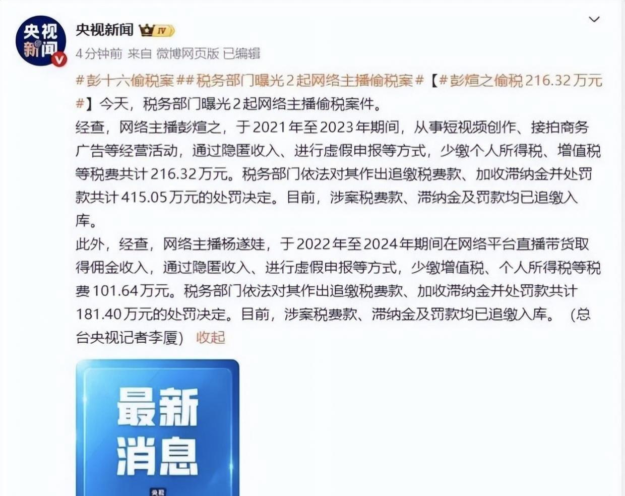 网红彭十六(本名彭煊之)因2021-2023年隐匿短视频及广告收入,累计偷逃税费216.32万元,被重庆税务部门追缴税款、滞纳金及罚款共415.05万元,并遭全平台账号禁言。其个人账户三年收款905万元却仅申报365万元,收入规模与纳税额严重失衡,成为文娱行业税务监管典型案例。由彭十六饰演核心配角"上官婉儿"的互动影游《盛世天下·女帝篇》面临重大调整。该角色占全剧40%戏份,涉及权谋主线与情感支