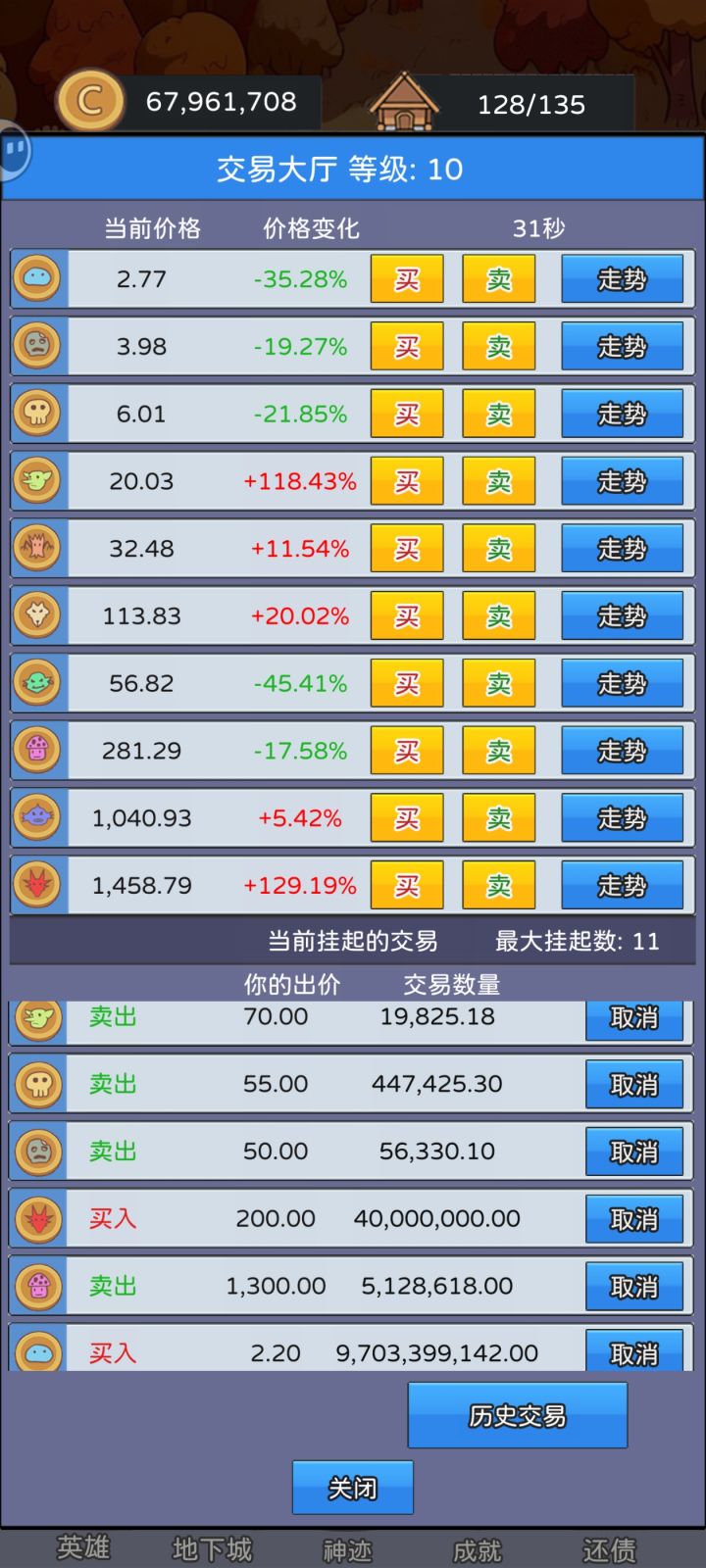 1.保底机制:游戏中的各种币有保底价格,例如史莱姆价格为2时,假设下一次是跌,但是价格并不会到2以下,可能是瞬间变成了3.8,利用此机制可以在低价梭哈,实现财富翻倍;即使公告栏事件是跌,也会触发保底机制。保底价格如下:史莱姆币 2 建议入手价格2-2.3僵尸币 3 建议入手价格 3-3.4骷髅币 4 建议入手价4-4.5哥布林币 5 建议入手价格 5-5.6树人币 20 建议入手价格2