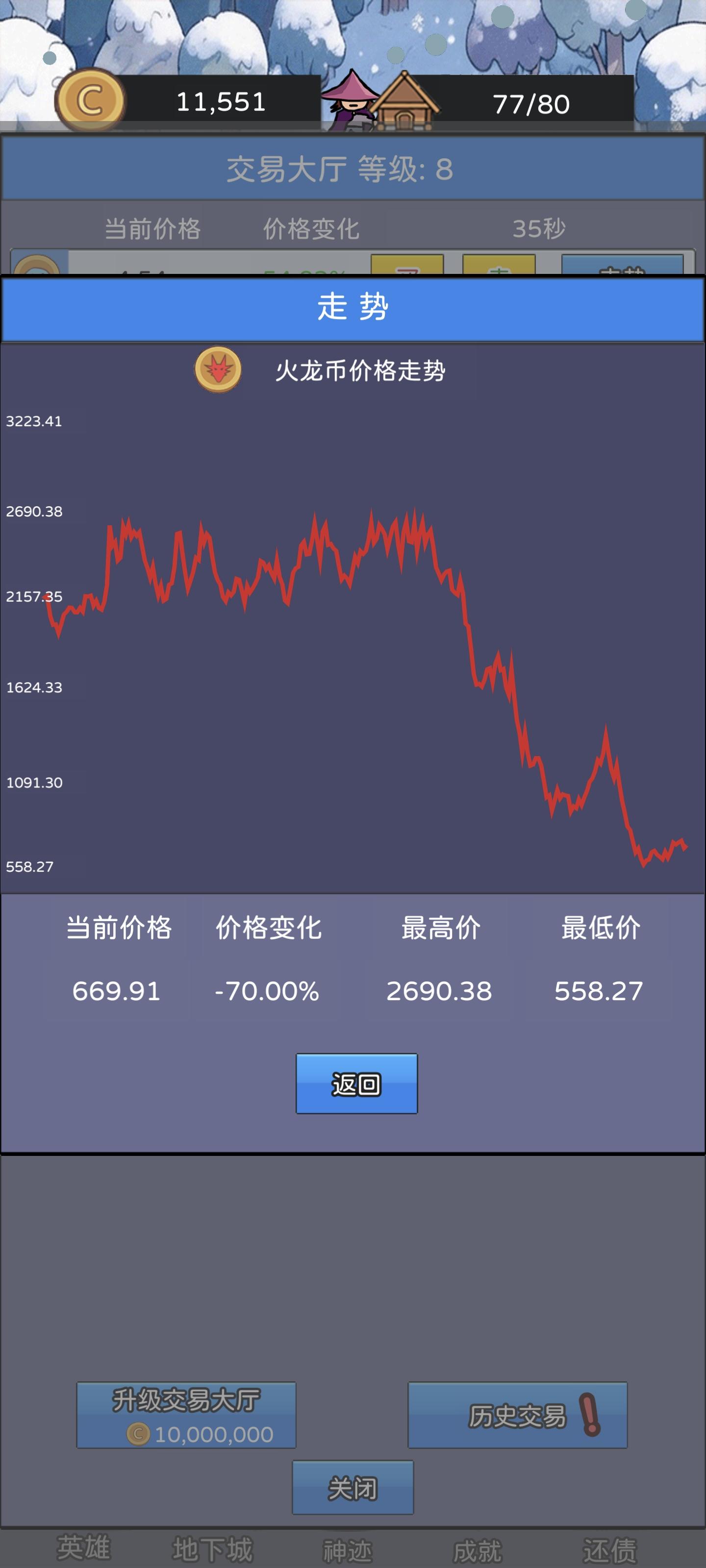 按照论坛老哥的攻略。触发保底买的。翻倍卖的。2天时间干了之前半个月的钱。1.保底机制:游戏中的各种币有保底价格,例如史莱姆价格为2时,假设下一次是跌,但是价格并不会到2以下,可能是瞬间变成了3.8,利用此机制可以在低价梭哈,实现财富翻倍;即使公告栏事件是跌,也会触发保底机制。 保底价格如下: 史莱姆币 2 建议入手价格2-2.3 僵尸币 3 建议入手价格 3-3.4 骷髅币 4 建议入手