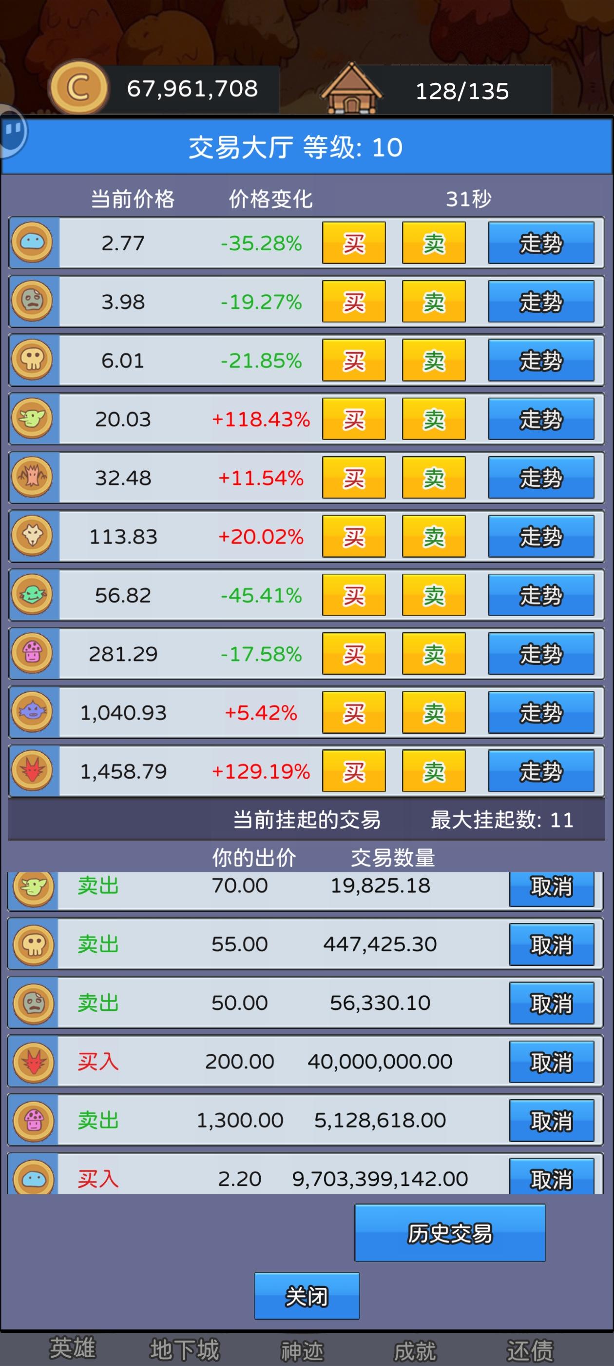 小技巧:在交易所里卖出或者买入魔物币时,并不一定要按显示的价格购买或者卖出。卖出时可以适当出高一点的价格,这样交易会挂在交易所内,等到价格涨到了你所挂出的价格会自动卖出。买入也时同理,可以低一点价格买入,当魔物币价格降到了你所挂出的价格会自动买入。前期一定要先把金币收益和离线收益先点上来。毕竟睡觉都有更多钱拿是最爽的。而英雄最高等级则可以放到最后再升级,毕竟前期根本升不到最高级。酒馆里雇英雄