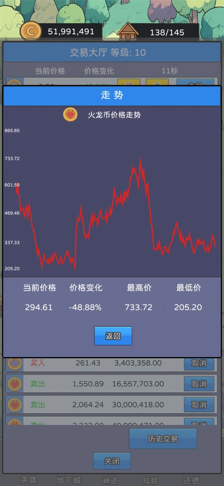按照论坛老哥的攻略。触发保底买的。翻倍卖的。2天时间干了之前半个月的钱。1.保底机制:游戏中的各种币有保底价格,例如史莱姆价格为2时,假设下一次是跌,但是价格并不会到2以下,可能是瞬间变成了3.8,利用此机制可以在低价梭哈,实现财富翻倍;即使公告栏事件是跌,也会触发保底机制。 保底价格如下: 史莱姆币 2 建议入手价格2-2.3 僵尸币 3 建议入手价格 3-3.4 骷髅币 4 建议入手