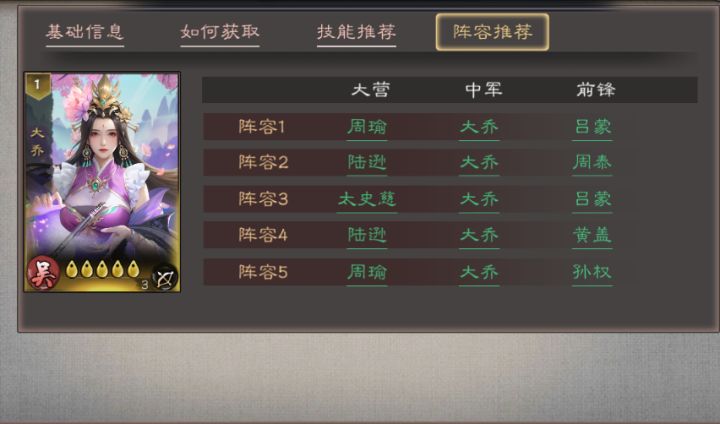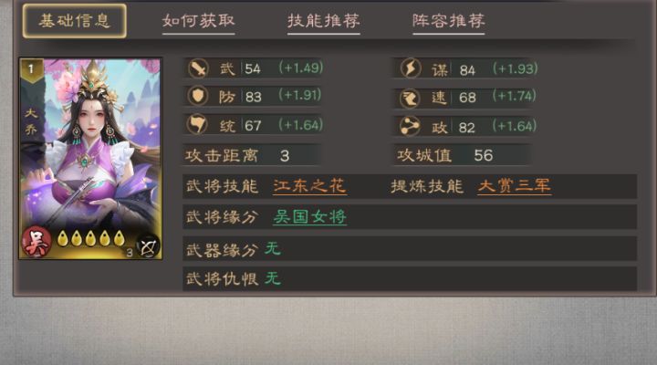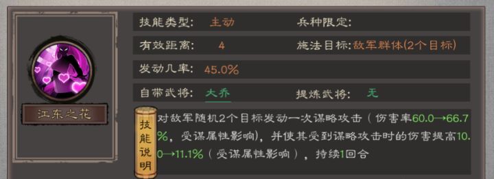 一、武将定位&梯度大乔是吴国辅助型谋士,定位为“增伤辅助+群体谋略副C”,梯度属于T1级辅助(在吴国阵容中是核心辅助之一)。她的自带技能“江东之花”既能打群体谋攻伤害,又能给敌军挂“谋攻易伤”debuff,搭配吴国谋攻核心(如周瑜、陆逊)时效果极佳。二、核心技能定位&梯度1. 自带技能:江东之花• 类型:主动技能(45%发动率)• 定位:群体谋攻+易伤辅助• 效果:对敌军2目标发动谋