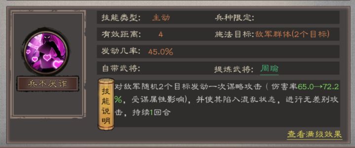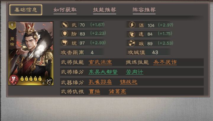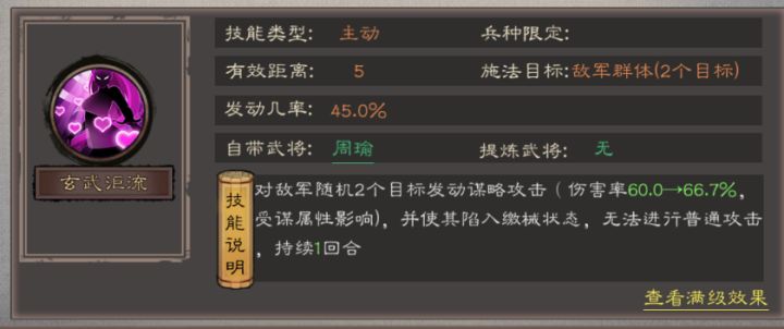 一、武将定位&梯度周瑜是吴国谋略输出核心,定位为“群体谋攻+控制型主C”,梯度属于T0级核心输出(吴国阵容的绝对核心,版本强势谋攻武将)。他的自带技能“玄武洰流”兼具群体谋攻伤害与缴械控制,是吴国谋攻队的输出与控场双担当。二、核心技能定位&梯度1. 自带技能:玄武洰流• 类型:主动技能(45%发动率)• 定位:群体谋攻+缴械控制• 效果:对敌军2目标发动谋攻(伤害受谋属性影响),并使