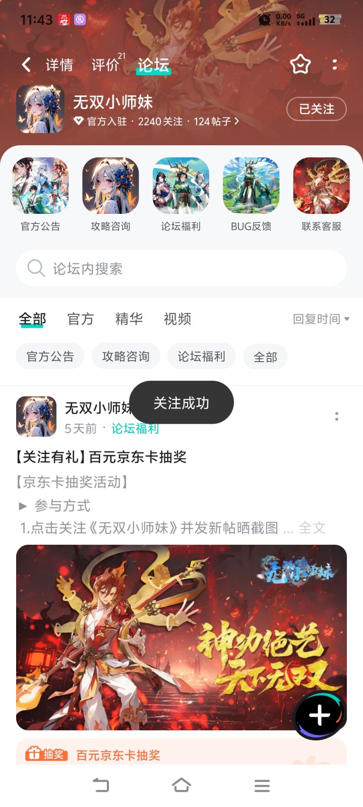 【京东卡抽奖活动】▶ 参与方式 1.点击关注《无双小师妹》并发新帖晒截图 2.在本帖下方评论区分享发帖链接即可【奖品发放】到达开奖时间后,由taptap系统随机抽取符合要求的幸运玩家,自动发放兑换码(对于同一账号大量故意发布评论刷楼层导致其他玩家中奖概率降低的行为的用户,将会可能被取消参与资格!)▶ 活动奖励 活动结束后将抽取1位幸运儿获得1张100元京东卡添加客服解锁更多机缘:📢