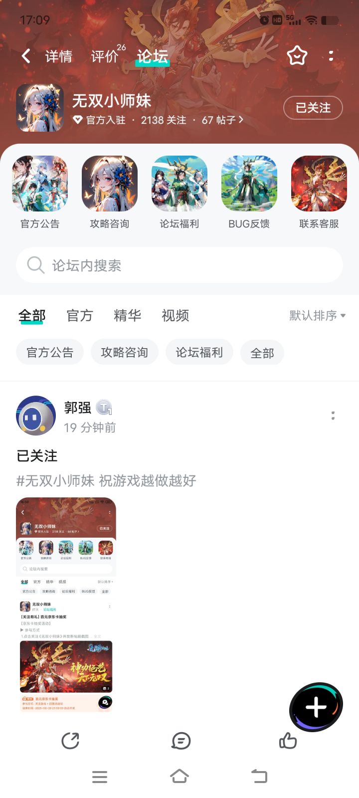 【京东卡抽奖活动】▶ 参与方式 1.点击关注《无双小师妹》并发新帖晒截图 2.在本帖下方评论区分享发帖链接即可【奖品发放】到达开奖时间后,由taptap系统随机抽取符合要求的幸运玩家,自动发放兑换码(对于同一账号大量故意发布评论刷楼层导致其他玩家中奖概率降低的行为的用户,将会可能被取消参与资格!)▶ 活动奖励 活动结束后将抽取1位幸运儿获得1张100元京东卡添加客服解锁更多机缘:📢