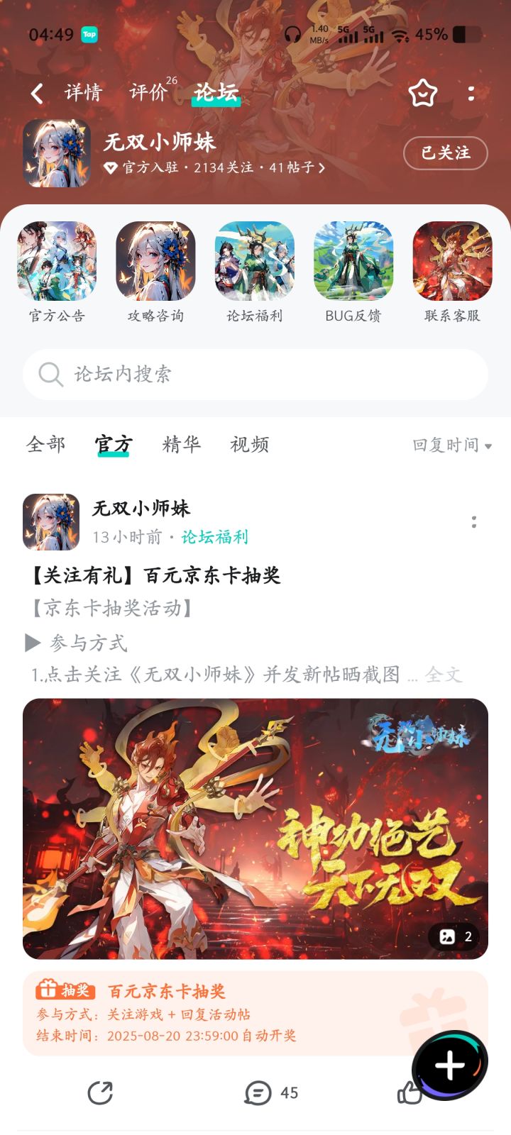 【京东卡抽奖活动】▶ 参与方式 1.点击关注《无双小师妹》并发新帖晒截图 2.在本帖下方评论区分享发帖链接即可【奖品发放】到达开奖时间后,由taptap系统随机抽取符合要求的幸运玩家,自动发放兑换码(对于同一账号大量故意发布评论刷楼层导致其他玩家中奖概率降低的行为的用户,将会可能被取消参与资格!)▶ 活动奖励 活动结束后将抽取1位幸运儿获得1张100元京东卡添加客服解锁更多机缘:📢