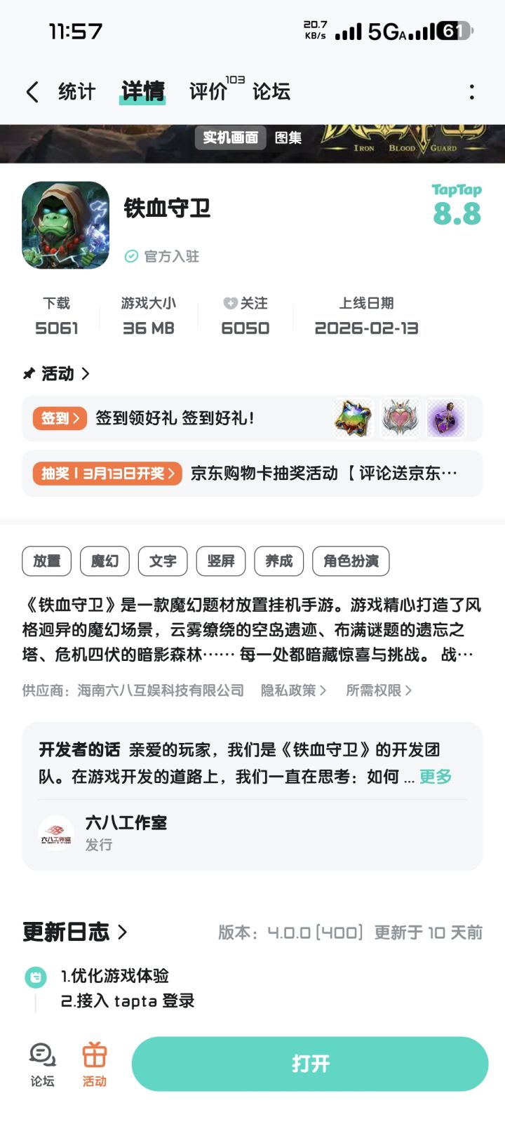 亲爱的玩家们:《铁血守卫》将于2026年2月13日10:00首发,欢迎大家前来体验,为此我们特地给大家准备了惊喜哦!快来预约下载吧⬇️⬇️⬇️活动一:新手福利:mz666、mz888活动二:添加客服QQ:2757945810领取新手礼包及好友礼包礼包内容:水晶*188、少量金币*10礼包内容:水晶*100、双倍经验药剂*1活动三惊喜福利:为感谢大家的关注和支持,当本活动参与人数超过3