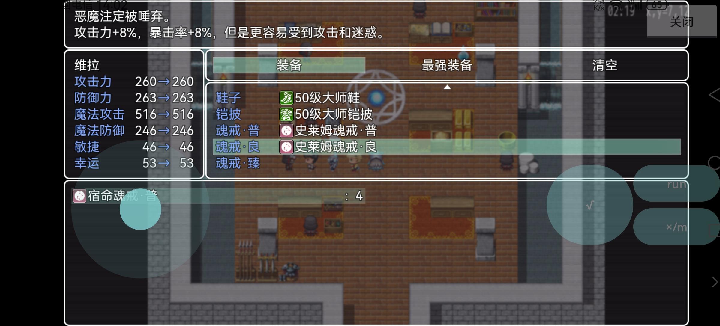 新增战斗加速,战斗中按住run键(能力有限,只能加速一点点)。修改键盘布局,增加键盘和触屏的开关选择。修复数十个已知bug,剧情可以推进到30级左右。魂戒系统修改(已有存档去政府修复)。酒水bug修复,打架前建议喝一口。因权限调整,暂时屏幕无法旋转,需要处理好传感器权限先(有点困难,需要点时间)以前魂戒有bug。如今魂戒加魂才能组成装备。看到今天好多人下载,让你们玩到那么多瑕疵实在抱