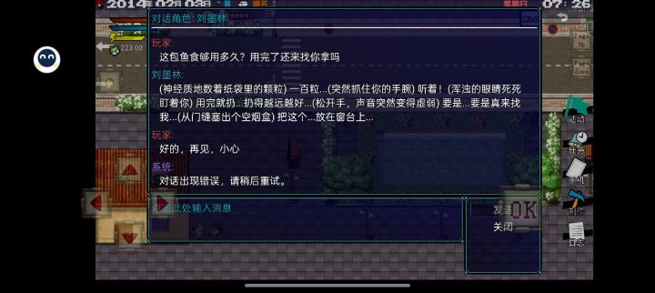 整体很新颖,已经很贴近生活了,尤其是接入AI,非常有意思,但AI回答的还是欠佳,非常期待后续更新。我觉得这游戏比较适合PC端玩,字和人物都比较小,看起来非常麻烦。还有这个游戏貌似缺少地图,如果界面没有地方放地图了,我觉得可以把地图放在手机里。还有就是人物靠近长椅,会自动弹出“是否休息”类似的字样,默认选项是“休息”,个人觉得马路不算宽敞,长椅就占了1/3,很容易碰到长椅,默认选项应该改为“取消”,