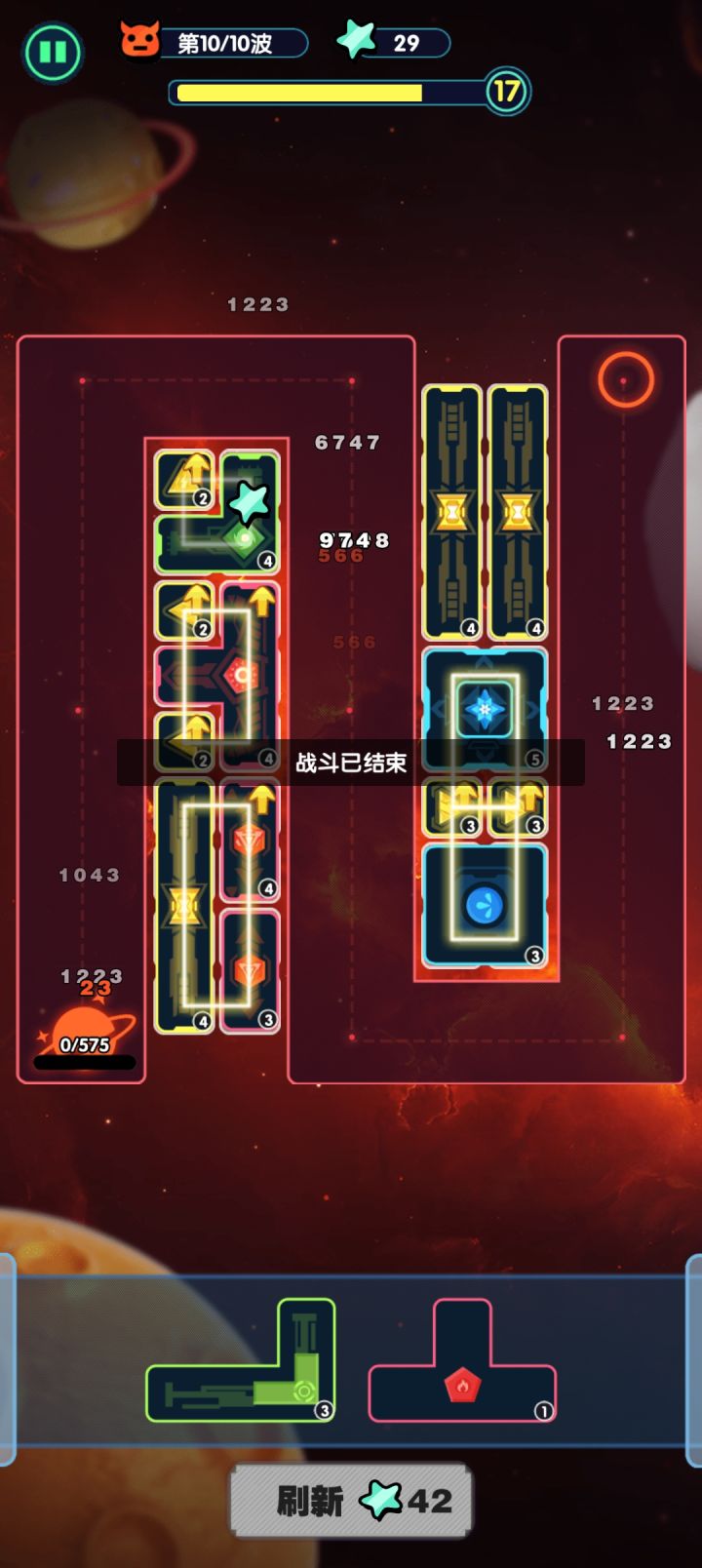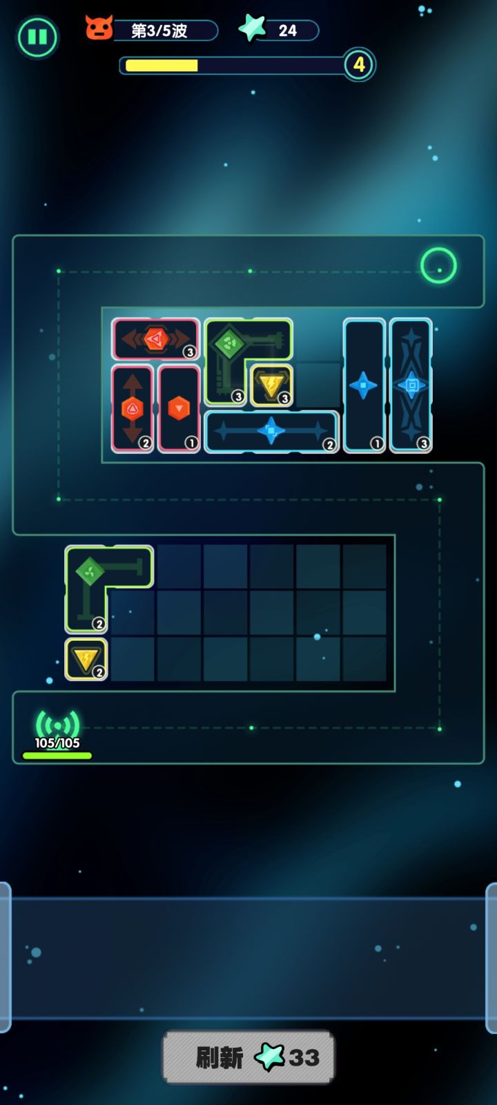 打了两天多,还卡在7-1。第四章和第五章是56个放置位(就是最小的格子),第六章是48格,第七章是36个,放置空间锐减还分成了两个长条,几乎没啥策略操作的空间。我配图这一局,大塔除了一个3级都是4级,还融合了一个5级,局外能点的都点满了,都完全看不到过关的希望。只能慢慢攒碎片和升级解锁天赋靠数据试试了
