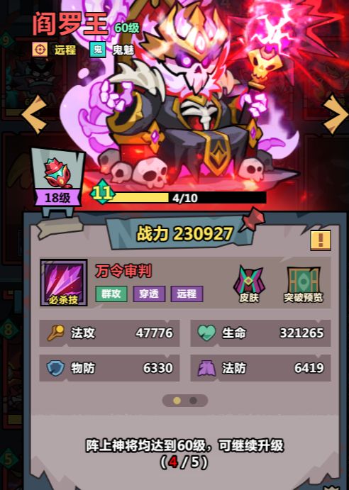 🔥养成建议: ☀️首先必推【阎罗王】,作为法术的输出核心之一,拥有远程、穿透、大范围aoe等多项优秀输出标签💯 ❗️获取途径: ➡️首充6元即可获得1个本体 ➡️通过神将召唤,每十抽必出一个红将,以及心愿机 ➡️如果购买成长礼包等,推荐自选【阎罗王】或者【盘古】 🔥组合推荐: 🔷法术队,推荐指数:⭐️⭐️⭐️⭐️⭐️ ☀️阵容核心:阎罗王、地藏王、燃灯佛、替补位观音或者孟婆(辅助能力的神将) ❗️