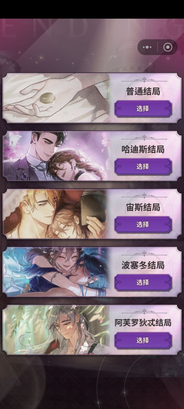 老婆们,等我们选了人后过完他的结局,看完我们不要点结束,直接退出,然后我们就可以又重新选过了(是大退哦)[当然前提是你要把他们每个人的好感刷满]