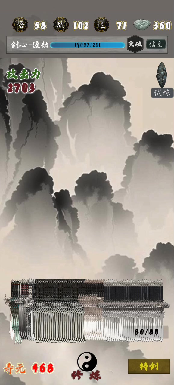 开局一把湛卢,剩下的事交给电表倒转🤣👉 我属于比较闲的,突然想体验一下一刀秒boss的爽感,于是就开了一个档刷了两天 前期比较幸运很快做出了湛卢开始叠杀人书,又做了两把渊虹增加石头掉落,然后就是基础配置4鱼肠+长生(我做了四把之后下面那一堆剑太多了不好排序,我自己又强迫症,就没再多做),中间陆陆续续做了一堆玄铁,把所有铸剑花费都减成1了😋最后就一直在做青霜,没别的,就是贪那点攻击 虽然我游戏理解不