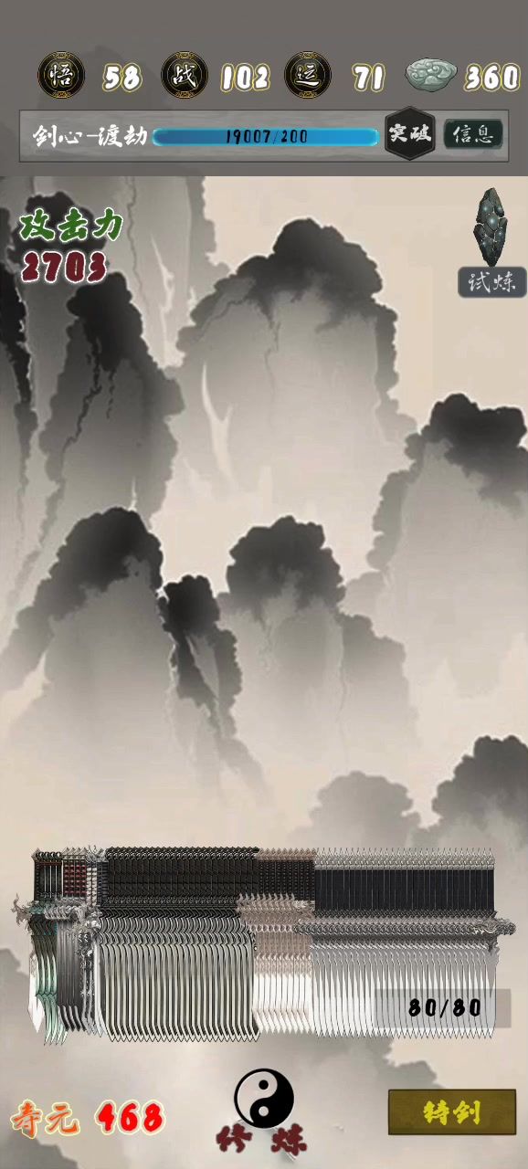开局一把湛卢,剩下的事交给电表倒转🤣👉 我属于比较闲的,突然想体验一下一刀秒boss的爽感,于是就开了一个档刷了两天 前期比较幸运很快做出了湛卢开始叠杀人书,又做了两把渊虹增加石头掉落,然后就是基础配置4鱼肠+长生(我做了四把之后下面那一堆剑太多了不好排序,我自己又强迫症,就没再多做),中间陆陆续续做了一堆玄铁,把所有铸剑花费都减成1了😋最后就一直在做青霜,没别的,就是贪那点攻击 虽然我游戏理解不
