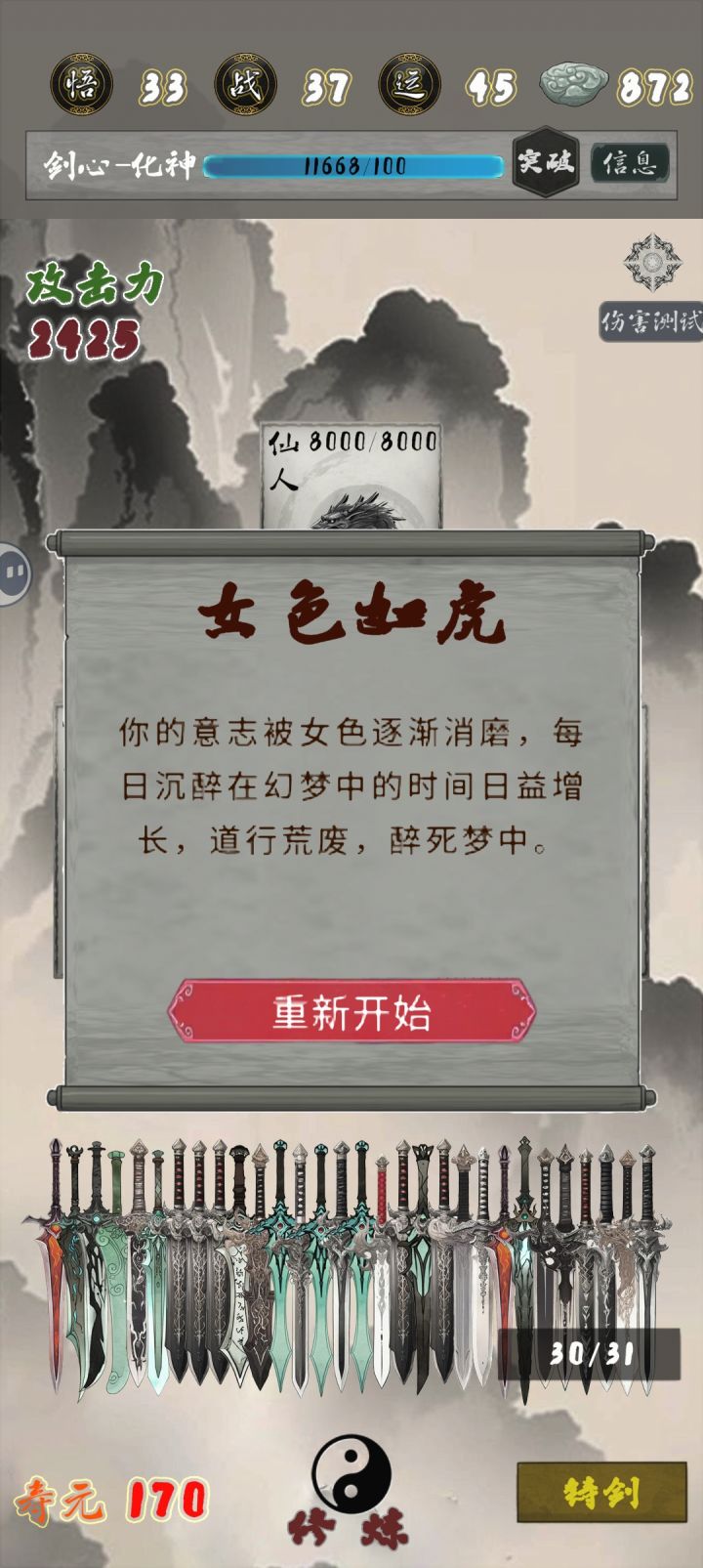 攻略1(运营向建议)首先我们要知道,相较于不知前几个版本来说,这确实是末法时代。天道石数量有限,鱼肠被限制。但对于末法时代的我们来说,辉煌盛世的遗留依旧强悍无双。(合成表在上面)在前期,我们打怪的收益极低(很多时候根本不掉东西),支撑商店消费很难。我不建议在任何有其他选项时打怪(除非是你没钱时候的商店)个人感觉(商店论外):特殊事件>剑没满时的剑冢(好像练气没有?)>高运赌石>(后期战斗)>