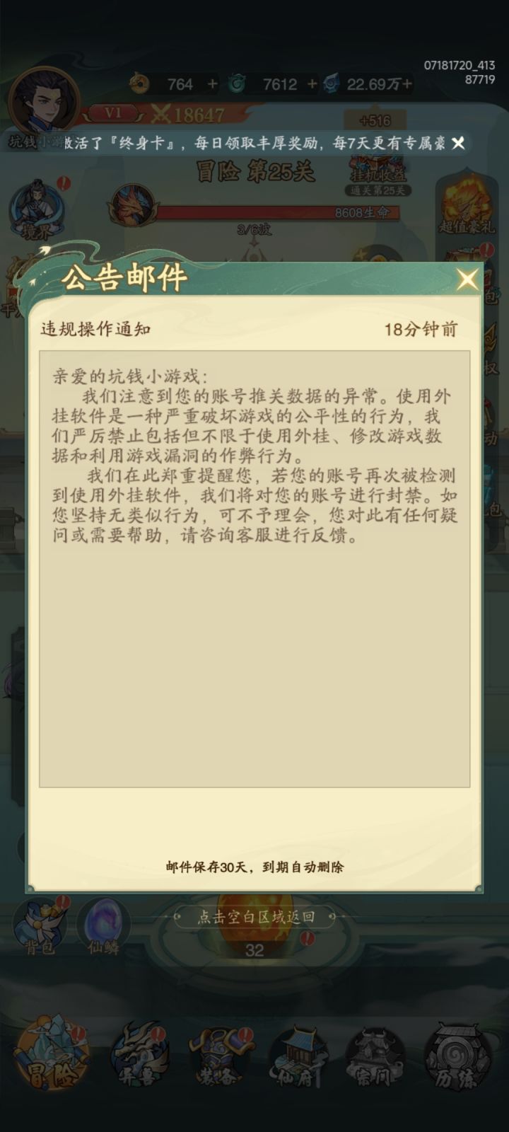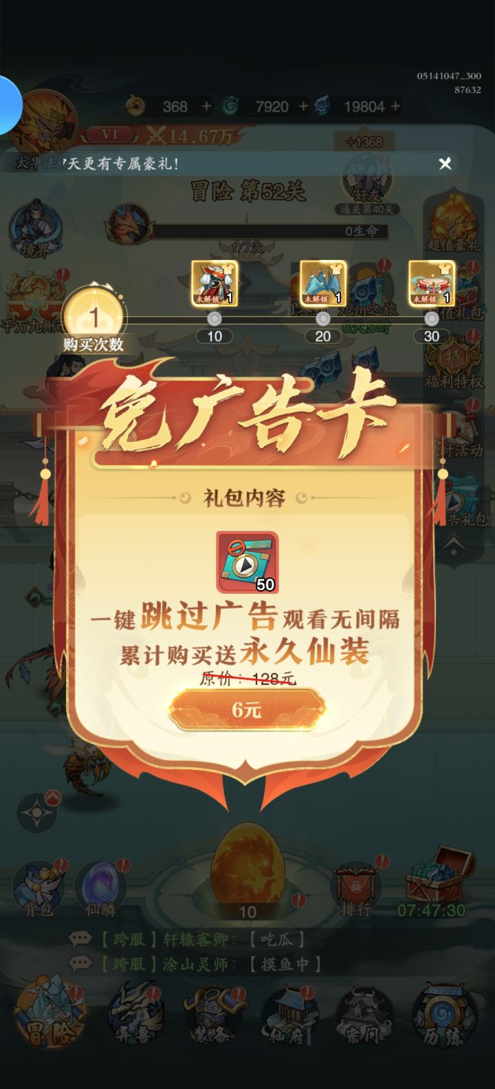 然后6块钱不是永久免广告,而是50次,然而50次根本不够点,怪我理解错了,浪费了六块钱。咸鱼之王换皮,玩不玩看你们自己了