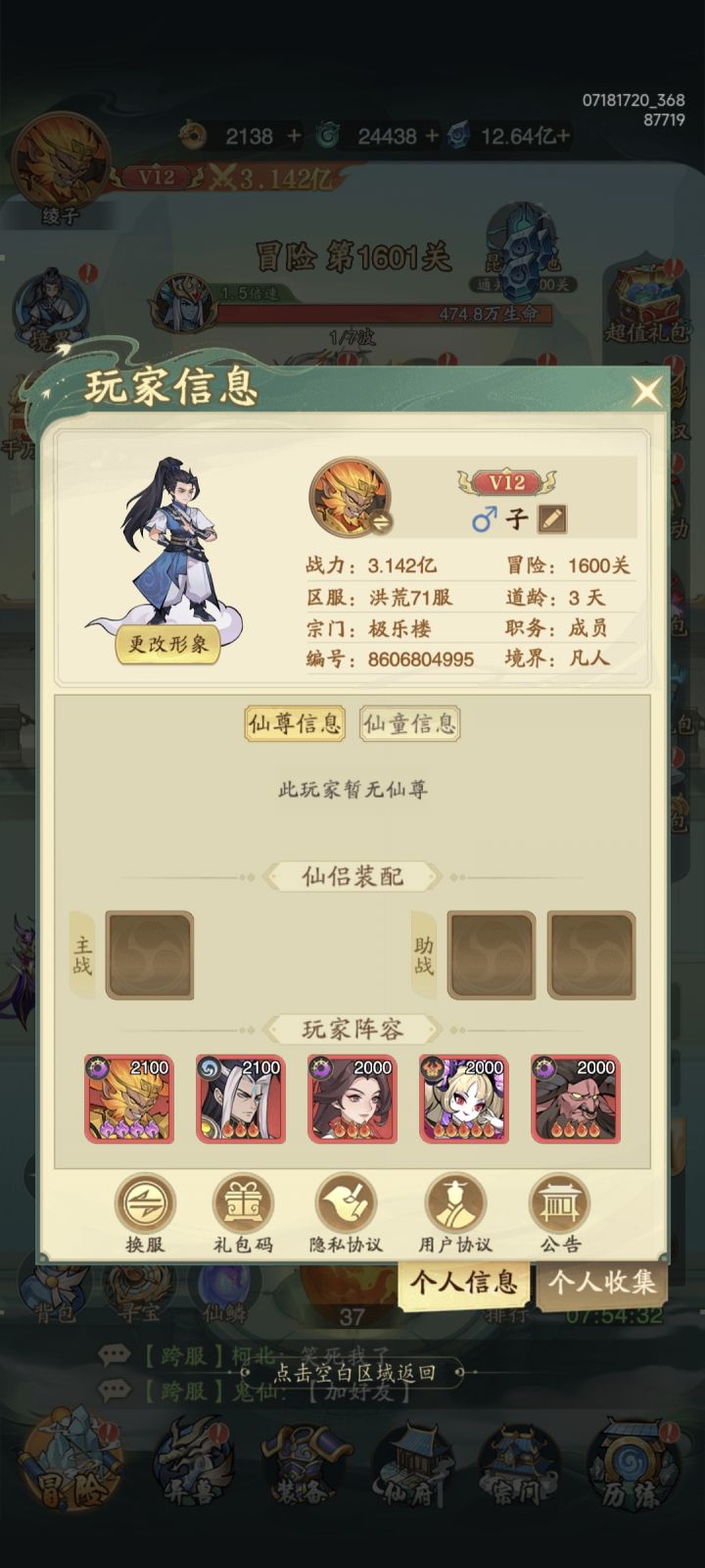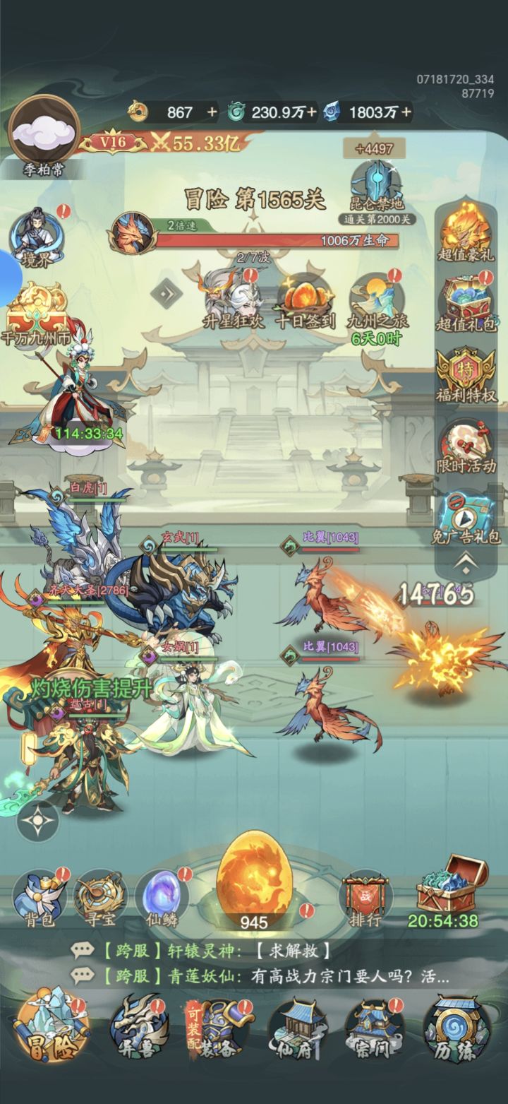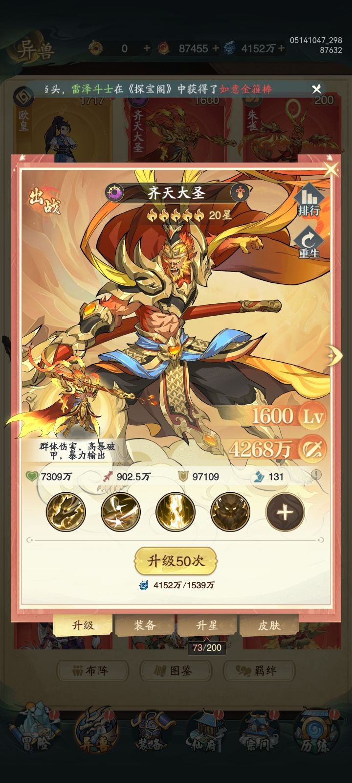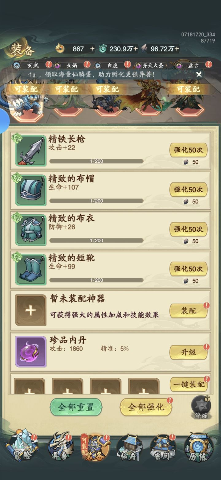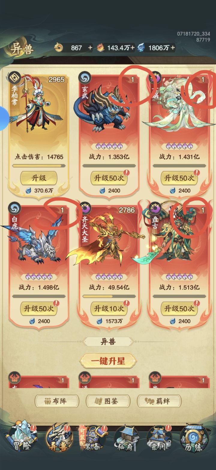 #九州异兽记攻略 新手血的教训 新开局玩家记得这游戏开始只需要养齐天大圣就行 所有资源倾向一个人战力照样打八方 有能力的开个6元免广告战力分分钟上亿 0氪比较苦逼广告刷的飞起 这游戏资源给的很足 仙玉看广告就可以给 而且给的蛮多的 还是不错的
