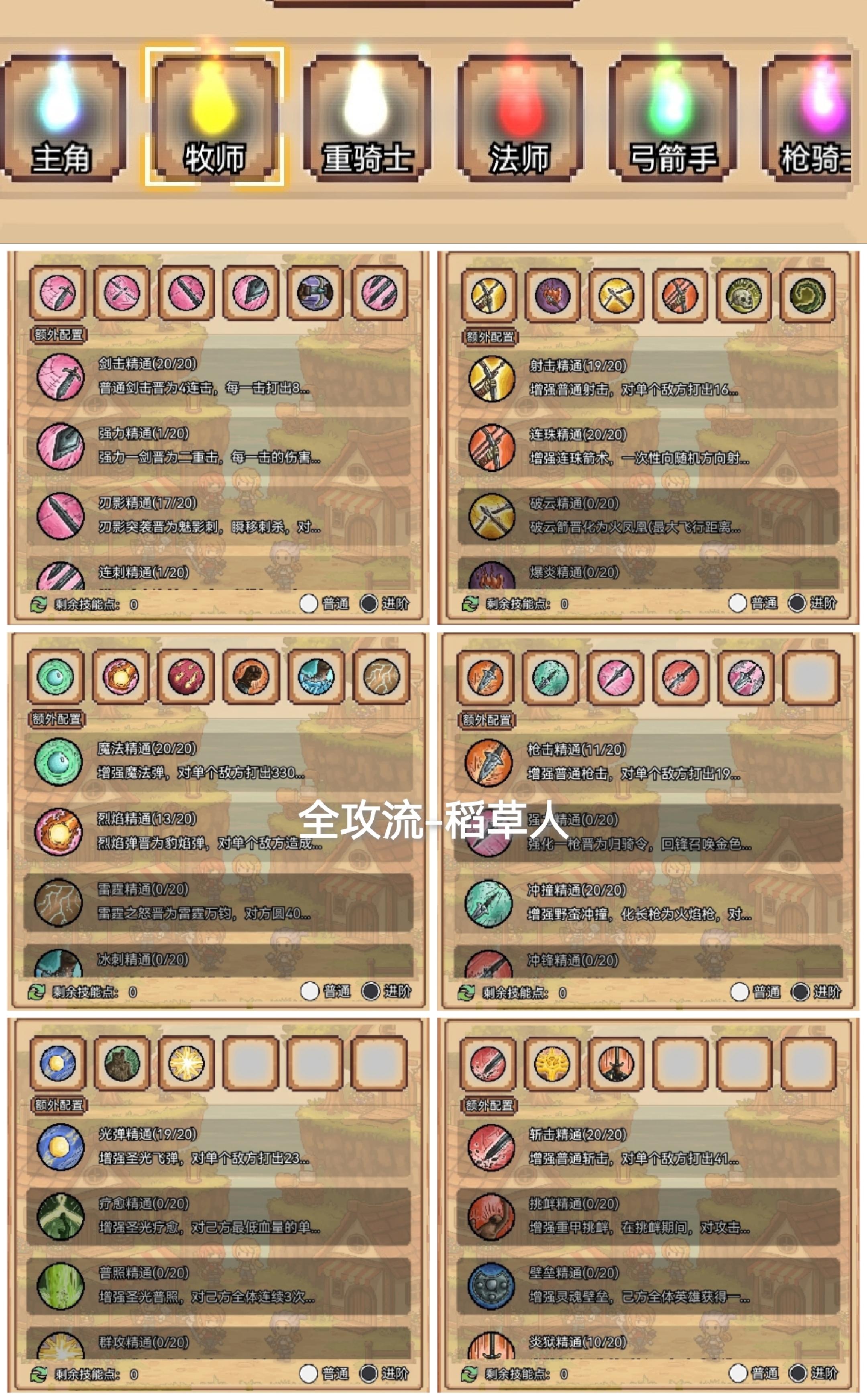 提问前给帖子点个赞,有问必答个人看法,不一定为最优解。1.职业解锁每10级主线任务解锁一次自选,主角是初始,推荐10级解锁法师,20级解锁弓箭,30级解锁牧师,40级解锁之重骑,50级解锁枪骑。2.对升级效率应该最大的职业排名:弓箭>法师>牧师>肉盾>枪骑>主角。3.魂火配置如图二所示,2火主最高攻击给法师/弓箭输出最大化,3火主最高防御给重骑抗伤最大化,5火偏