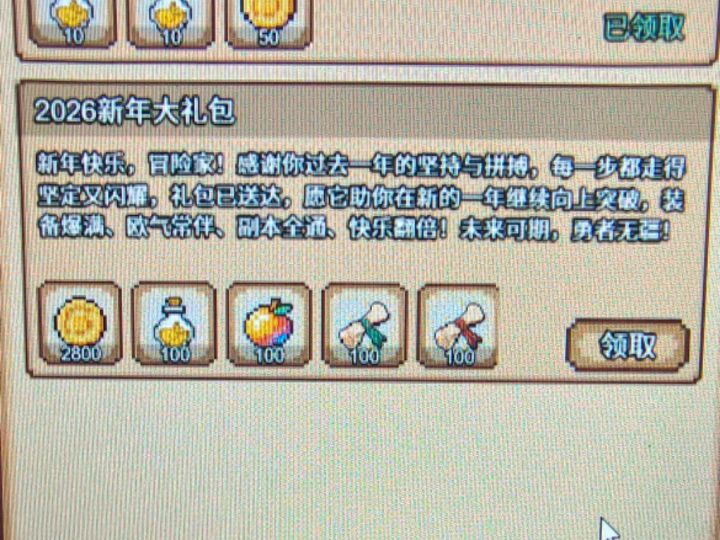 新年快乐,冒险家!感谢你过去一年的坚持与拼搏,每一步都走得坚定又闪耀,礼包已送达,愿它助你在新的一年继续向上突破,装备爆满、欧气常伴、副本全通、快乐翻倍!未来可期,勇者无疆!礼包已发至,请及时在邮箱里领取!#像素冒险村 #放置挂机 #新年快乐