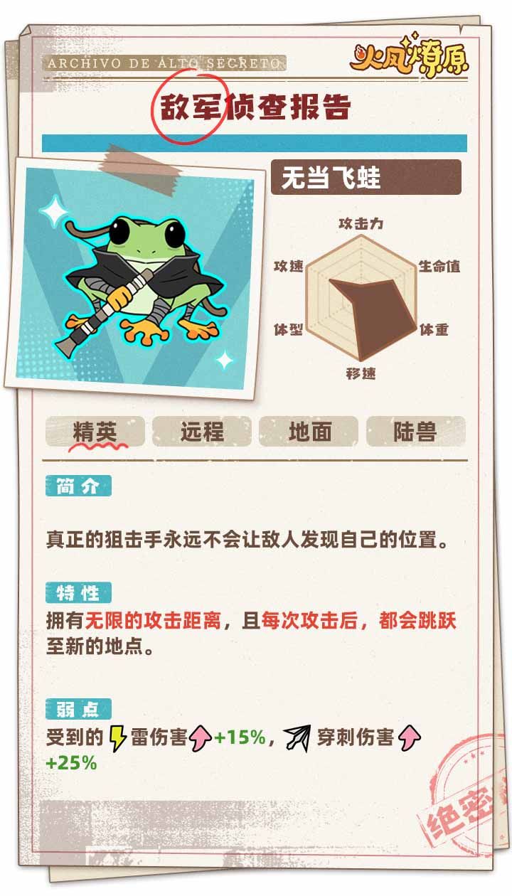 这次的敌人不容小觑,情报官也只能十分小心地获得情报,快来看看! 跳来跳去的敌人属实有点烦,主公,在无当飞蛙还没出现前,先使用机关技能进行提前防御吧!会远距离攻击的敌人如果没有投石机进行阻挡,TA会在极远的位置就给予伤害,对于希望满血通关的主公来说,会比较头疼。但好在本身血量不高,快速使用远程技能消灭吧!