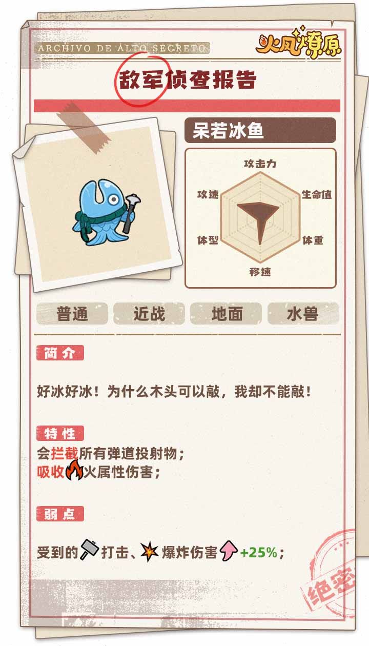 情报官送来了前线的情报,快来看看吧!和木鱼不喜欢被人敲不同,其实呆若冰鱼很想试试被人敲的感觉,那样会让TA感觉不错。主公,对付TA的思路就有了,机关技能和能发生爆炸的火法技能都可以试试。