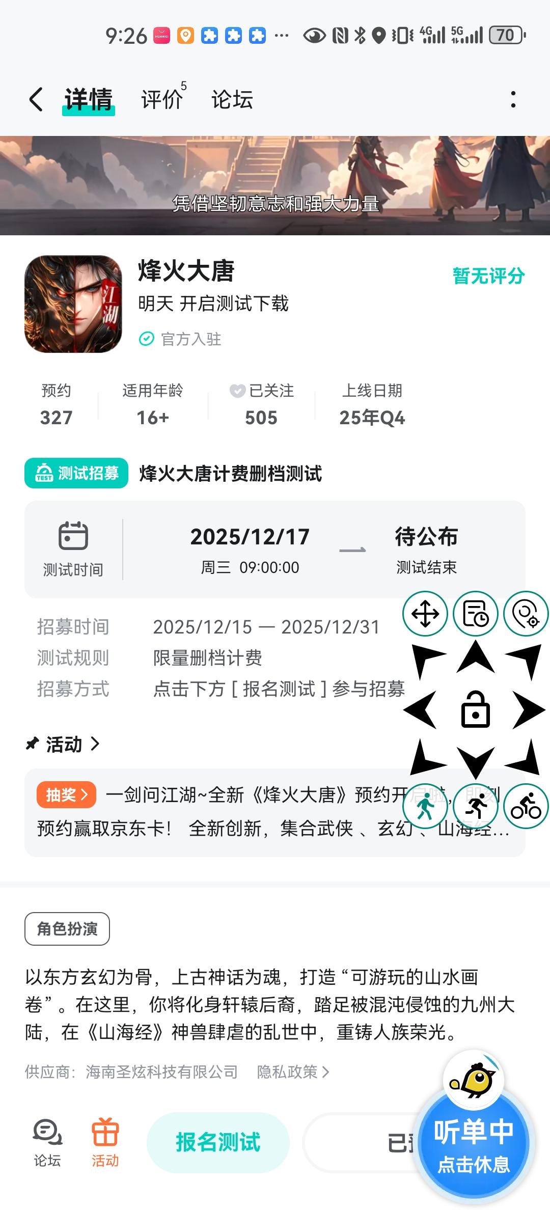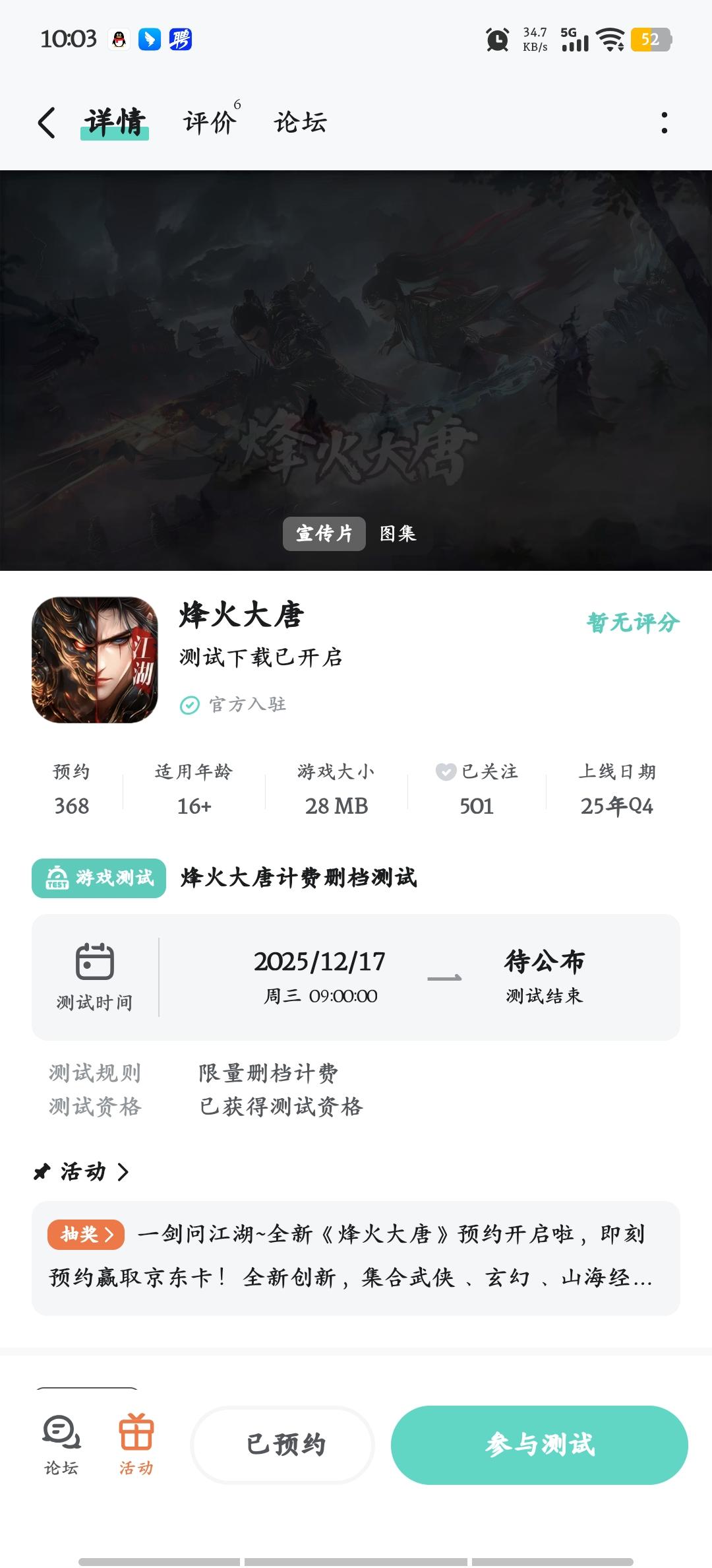 各位英雄好汉:诚邀您于 12 月 17 日 09:00前来赴约,不论身世,不论剑法,这场江湖盛宴将和您一同见证!全新版本体验,以东方玄幻为骨,上古神话为魂,打造 “可游玩的山水画卷” 。在这里,您将化身轩辕后裔,踏足被混沌侵蚀的九州大陆,在《山海经》神兽肆虐的乱世中,重铸人族荣光。《烽火大唐》暖冬测试于12月17日正式开启,我们已经准备好了。期待与您相遇,即刻预约赢取京东卡好礼,测试期间也会有