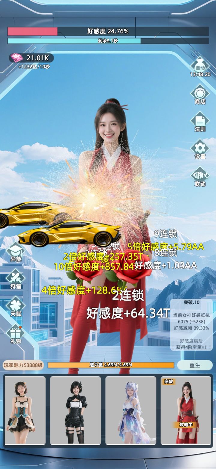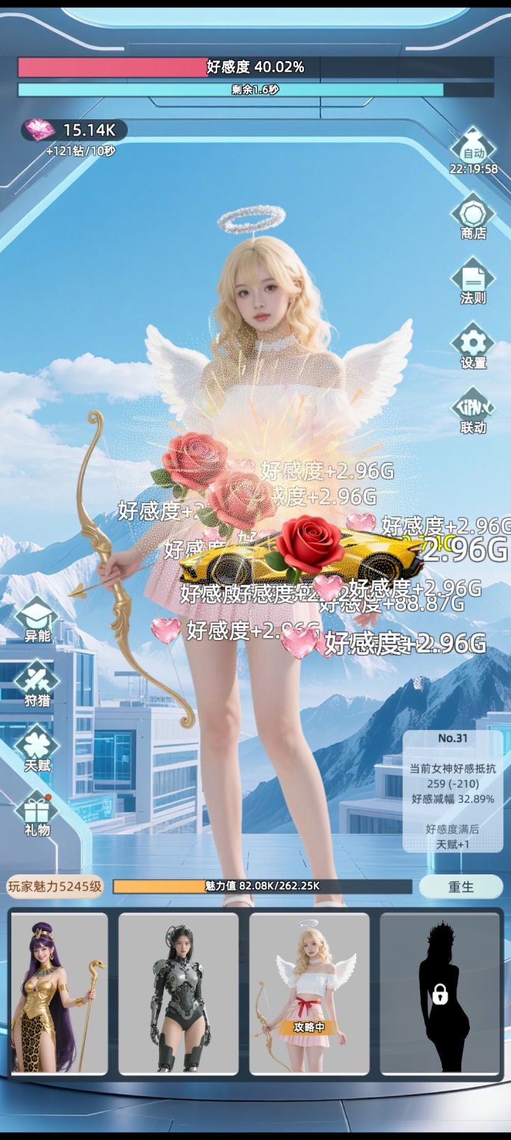 首先,每天0点自然刷新6个广告,每次法则相当于刷新一天,也是6个广告,游戏每天一次免费法则,进游戏前20天有20次额外法则。也就是前20天每天满18个广告,20天后每天满12个广告免广。这是单机无内购无免广售卖的游戏,作者就靠这点广告赚钱,接受不了这些广告的可以找免广游戏,请勿差评,良心游戏,请手下留情,谢谢。攻略:1、游戏内核游戏内核就是攻略女神,游戏里面有四种礼物和三种异能。礼物是玫瑰、