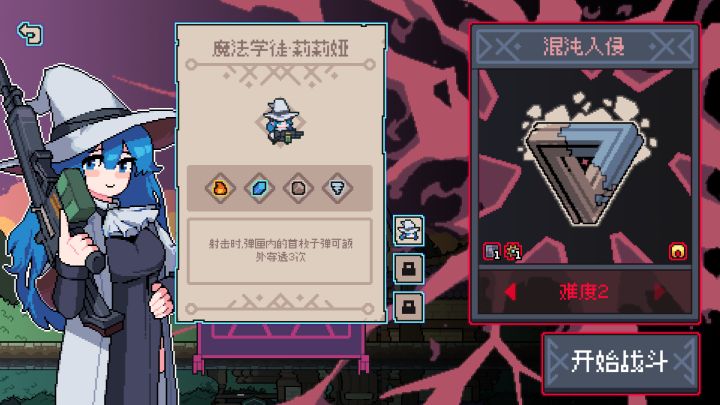 《奥术扳机》是一款子弹构筑的肉鸽射击游戏,是由开发过《魔王终局》制作组的新作品,大致讲述了一位魔女前去讨伐混沌,却被打败了,所以另一个魔女从家里出发再次挑战。游戏共有三名角色,每个角色都有不同的技能以及侧重点玩法,当通关了一个难度之后,就能取到下一个难度,直到无尽。游戏算是回合制的,一共有15个关卡,只有都通过之后才算通关,每一个管家里又有不同的怪物波次,所以玩家需要利用子弹来消灭它们,敌人会从