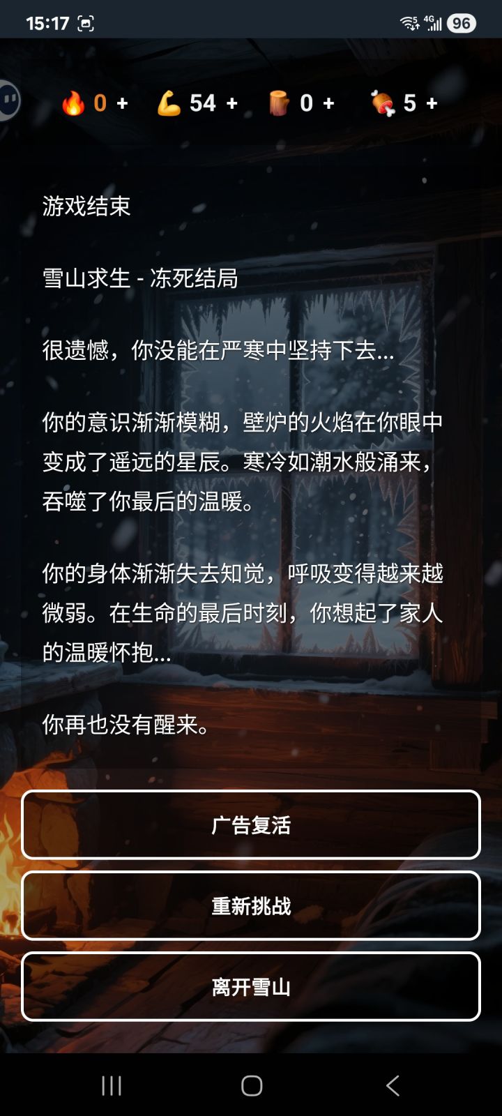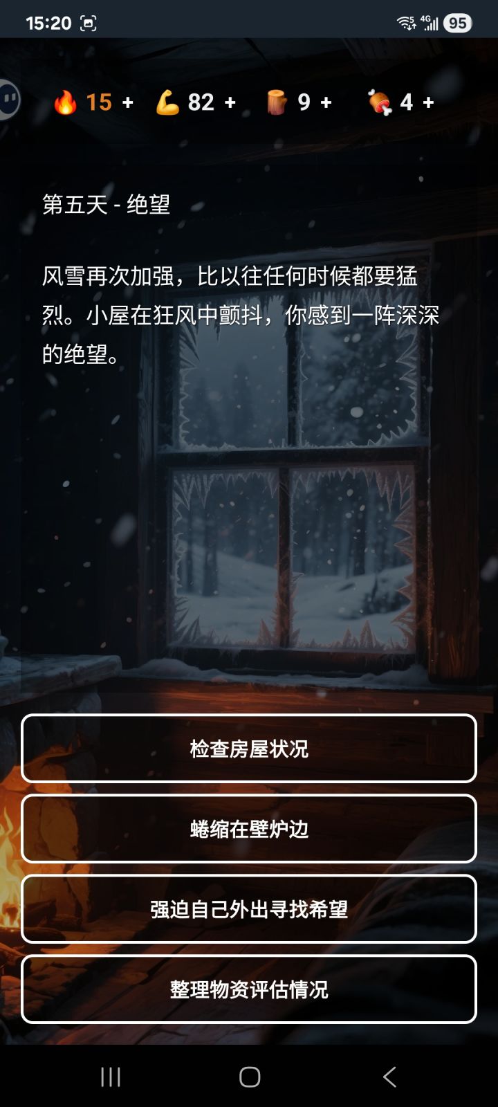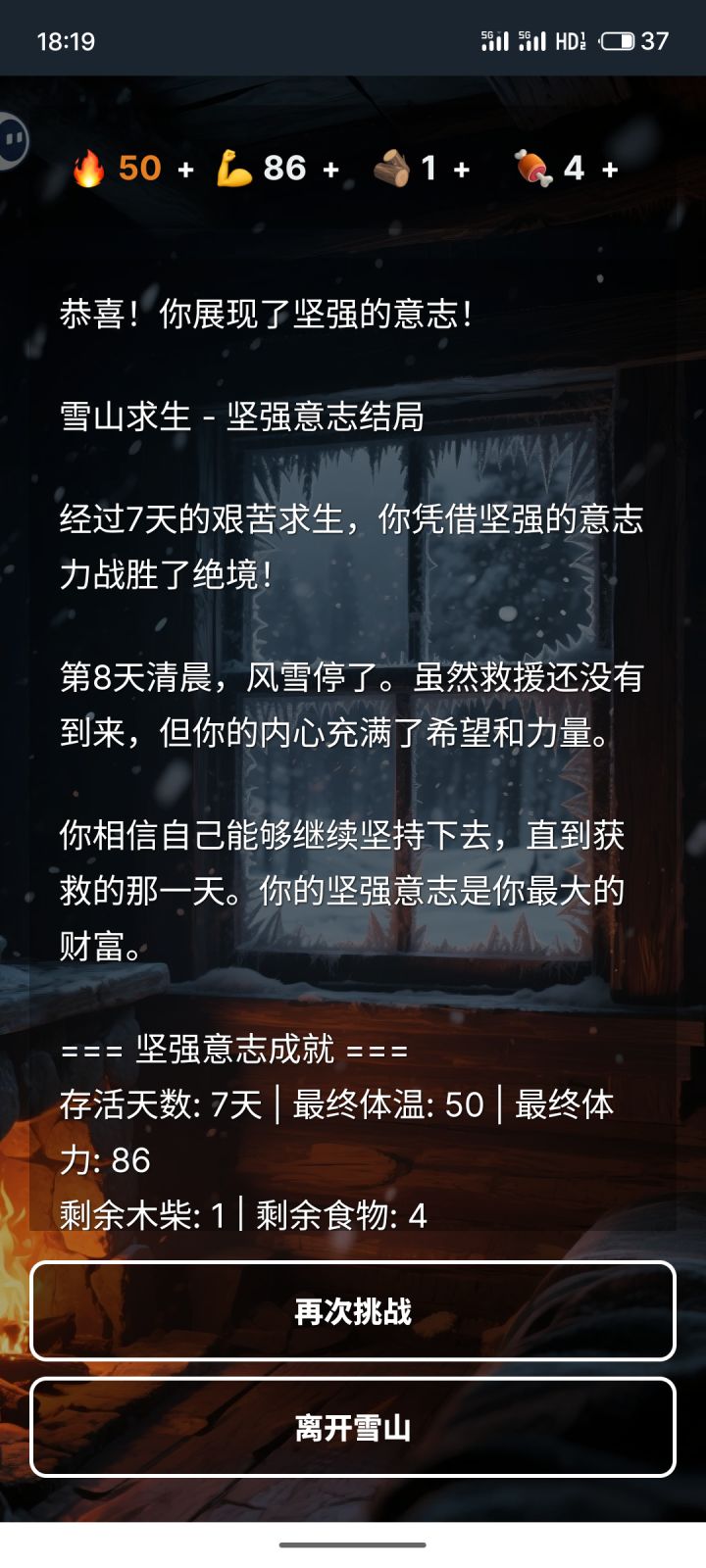 文字冒险类游戏,和昨天看的最后七日有点像,都是要在艰难条件下活下去。有温度、体力、木柴、食物四维属性,除了木柴外,其他都需要维持在正常数值,否则就会迎来死亡结局。