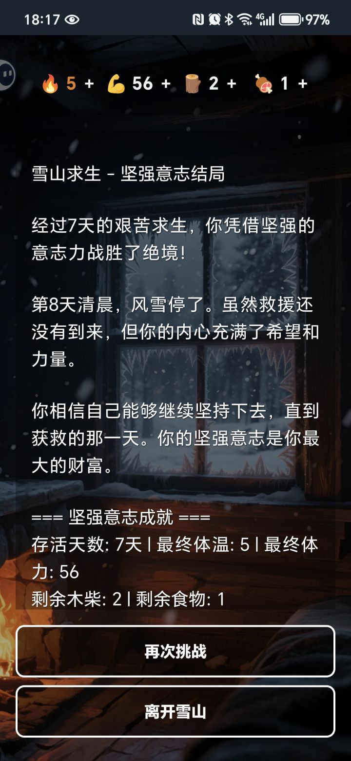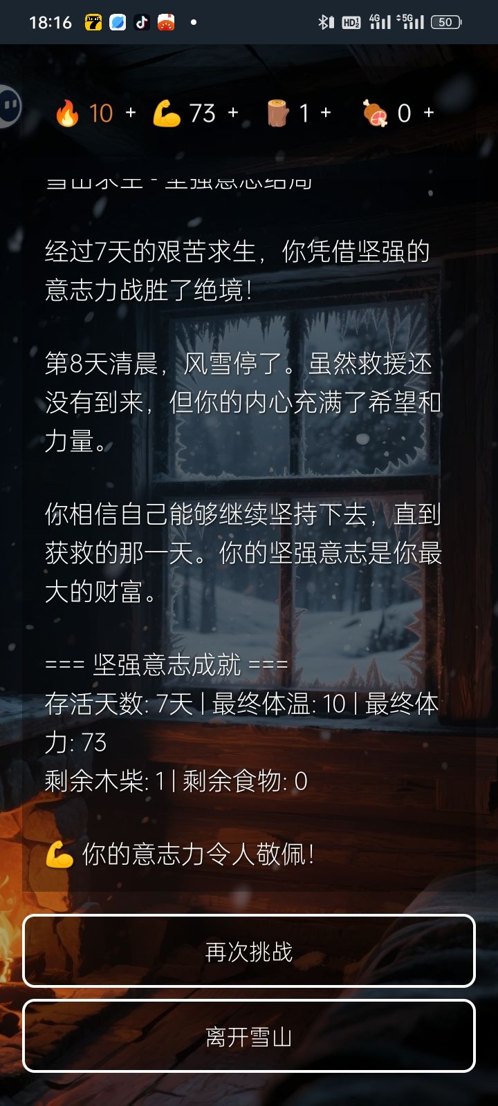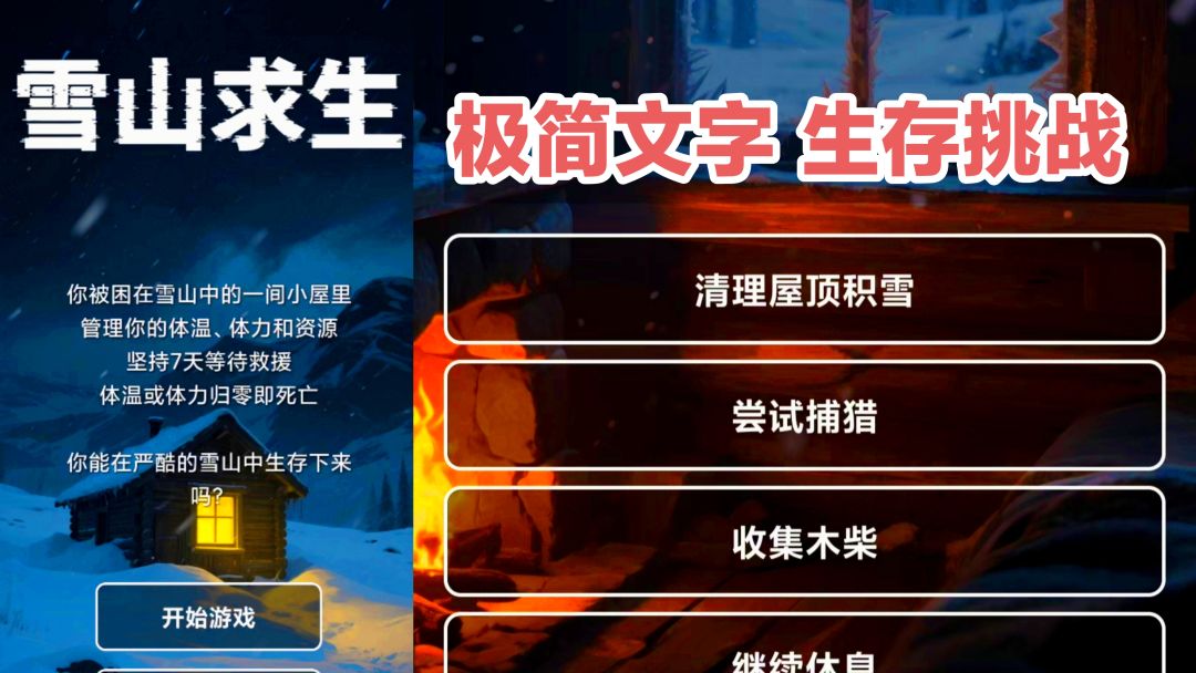建议:文字冒险类游戏要么在文案上下功夫(文本量、精彩程度),要么就尽量让画面、配乐上更丰富,希望作者能够优化一下或者作出更精彩的游戏[心动小镇_点赞]加油 #雪山求生 #游戏安利 #游戏推荐 #游戏攻略 #生存游戏 #游戏种草计划