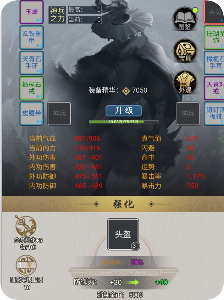 一、前期——红色神兵原坯前期就一个东西,打红色神兵原坯,第一个打到的人飞起般的感觉。地图:桃岛大将军产出:红色神兵原坯推荐双防:1350防御1. 唐门,10级金玉冰蚕丝,可以临时增加200点双防,所以唐门1150左右双防御下限可试试打。2. 武当、天策1200点双防可试试,尤其注意双护腕要金色的,有传说属性吸血。吸血=加防。3. 金币可以鉴定红色装备,前期图鉴加双防的,一定要用红色的
