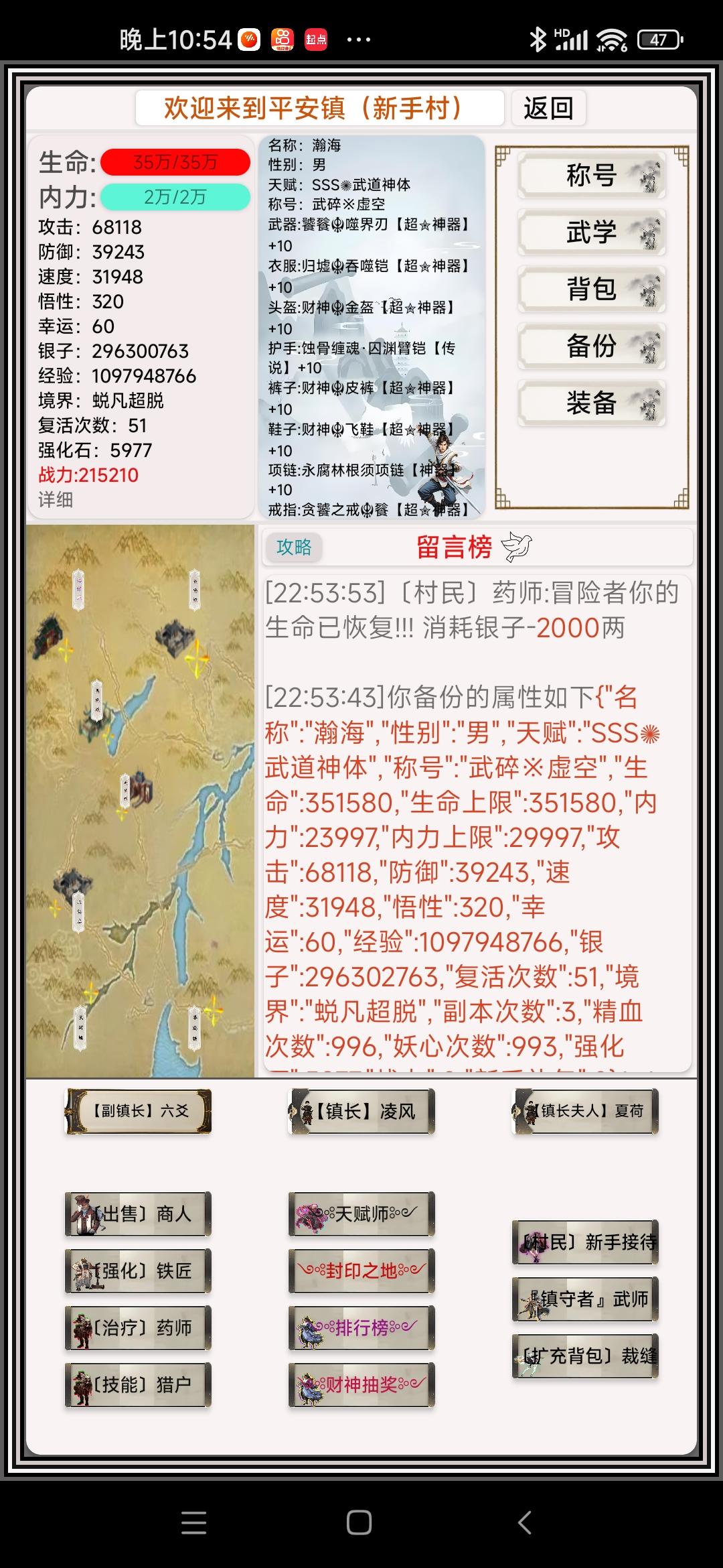 本游戏大纲有七个地图,第一个地图是新手村,相当于试炼场,二图初始属性由一图最终属性来定。一图基本上以完善,还有些小问题待测试慢慢修复和完善。不影响玩。这里发个视频了解下二图玩法,相对于一图的简单比拼数据,二图增加了吸血,闪避暴击破甲攻速等多元素玩法。